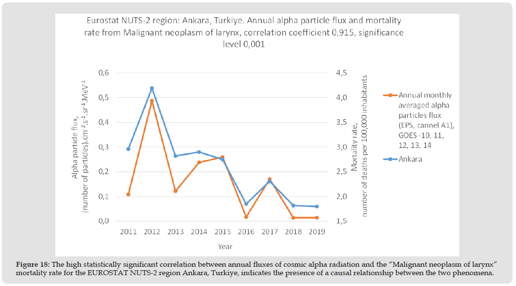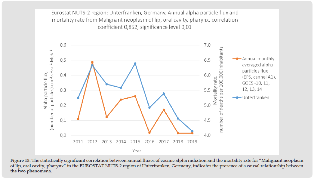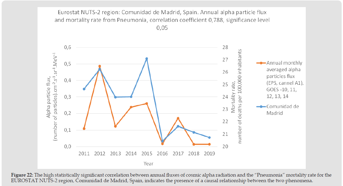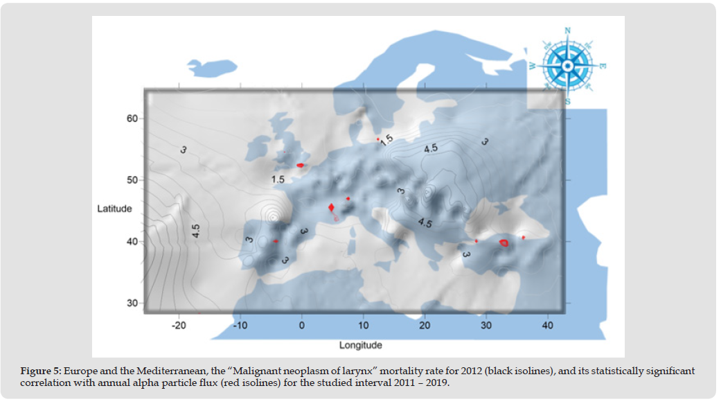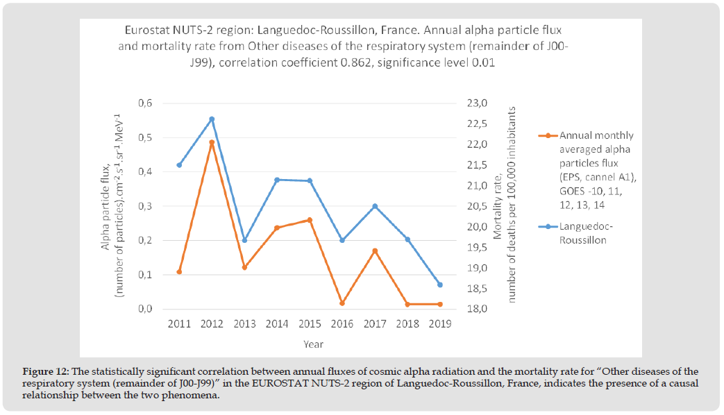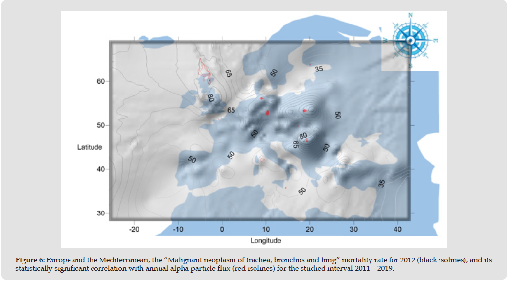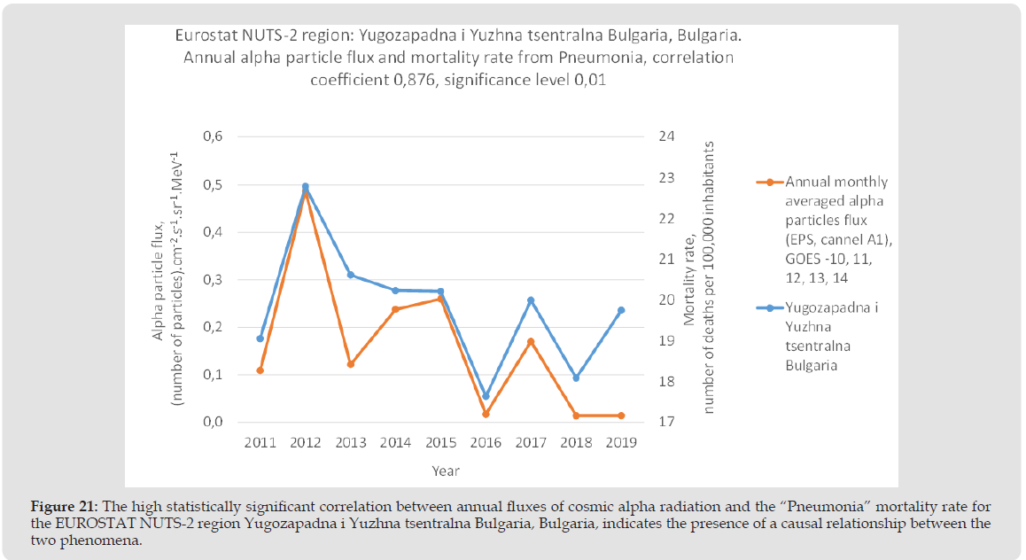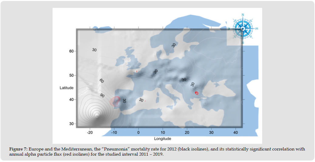 The statistically significant influence of alpha radiation on mortality from “Malignant neoplasm of lip, oral cavity, pharynx” is limited to separate areas covering Central Germany, Romania, and Bulgaria. The 2012 mortality peak and correlation maximum for Romania between annual mortality with annual solar alpha fluxes coincide, indicating that high-energy solar alpha fluxes are causally related to mortality from the mentioned disease in the specified region. Examples of a high correlation between solar alpha radiation annual flux and mortality from “Malignant neoplasm of lip, oral cavity, pharynx”, are shown in Figures 15 & 16. Figure 5 shows the distribution of the mortality rate for the EUROSTAT shortlist death cause „ Malignant neoplasm of larynx” for Europe and the Mediterranean for the studied interval. The statistically significant influence of alpha radiation on mortality from “Malignant neoplasm of larynx” is limited to specific areas covering Southern Britain, Northern Poland, Central Spain, Southern France, Switzerland, and Northern Turkey. The 2012 mortality peak and correlation maximum for Switzerland and Turkiye between annual mortality with annual solar alpha fluxes coincide, indicating that high-energy solar alpha fluxes are causally related to mortality from the mentioned disease in the specified region. Examples of a high correlation between solar alpha radiation annual flux and mortality from “Malignant neoplasm of larynx”, are shown in Figures 17 & 18. Figure 6 shows the distribution of the mortality rate for the EUROSTAT shortlist death cause „ Malignant neoplasm of trachea, bronchus and lung” for Europe and the Mediterranean for the studied interval. The statistically significant influence of alpha radiation on mortality from “Malignant neoplasm of trachea, bronchus and lung” is limited to separate areas covering Northern Britain, Central and Northern Germany, Central Poland, and the Northern Balkans. The 2012 mortality peak and correlation maximum for Central Poland and Northern Balkans between annual mortality with annual solar alpha fluxes coincide, indicating that high-energy solar alpha fluxes are causally related to mortality from the mentioned disease in the specified regions. Examples of a high correlation between solar alpha radiation annual flux and mortality from “Malignant neoplasm of trachea, bronchus and lung” are shown in Figures 19 & 20. Figure 7 shows the distribution of the mortality rate for the EUROSTAT shortlist death cause „Pneumonia” for Europe and the Mediterranean for the studied interval. The statistically significant influence of alpha radiation on mortality from “Pneumonia” is limited to separate areas covering Bulgaria, Portugal, Northern France, and the Balearic Islands. Examples of a high correlation between solar alpha radiation annual flux and mortality from “Pneumonia” are shown in Figures 21 & 22.