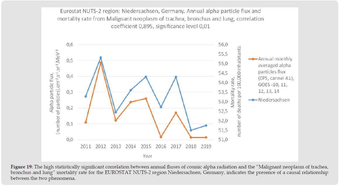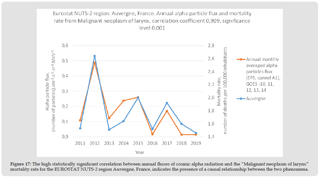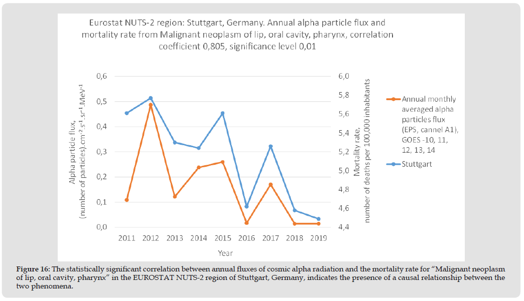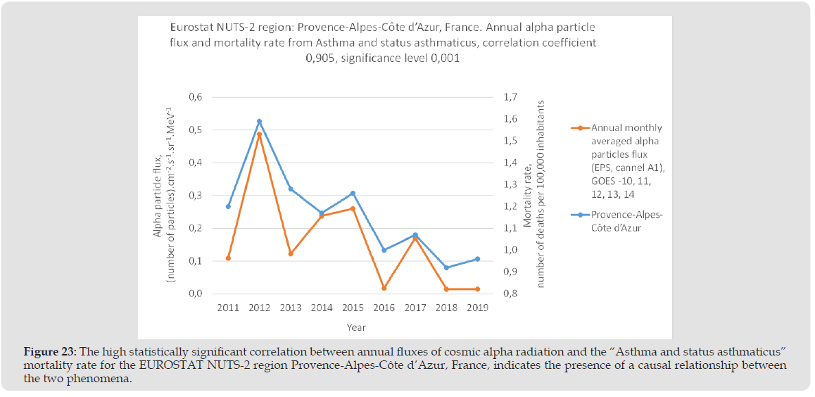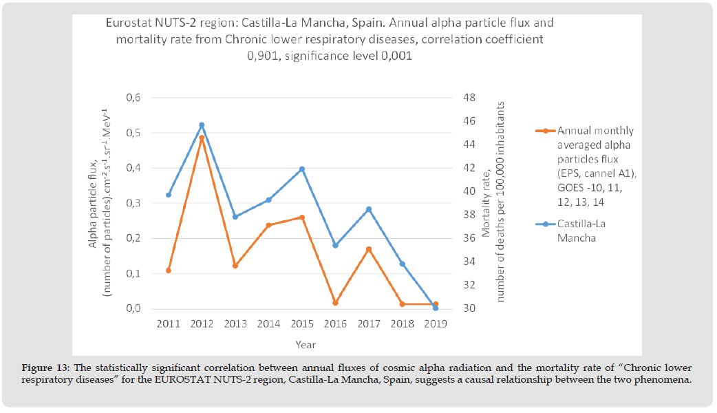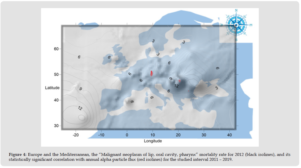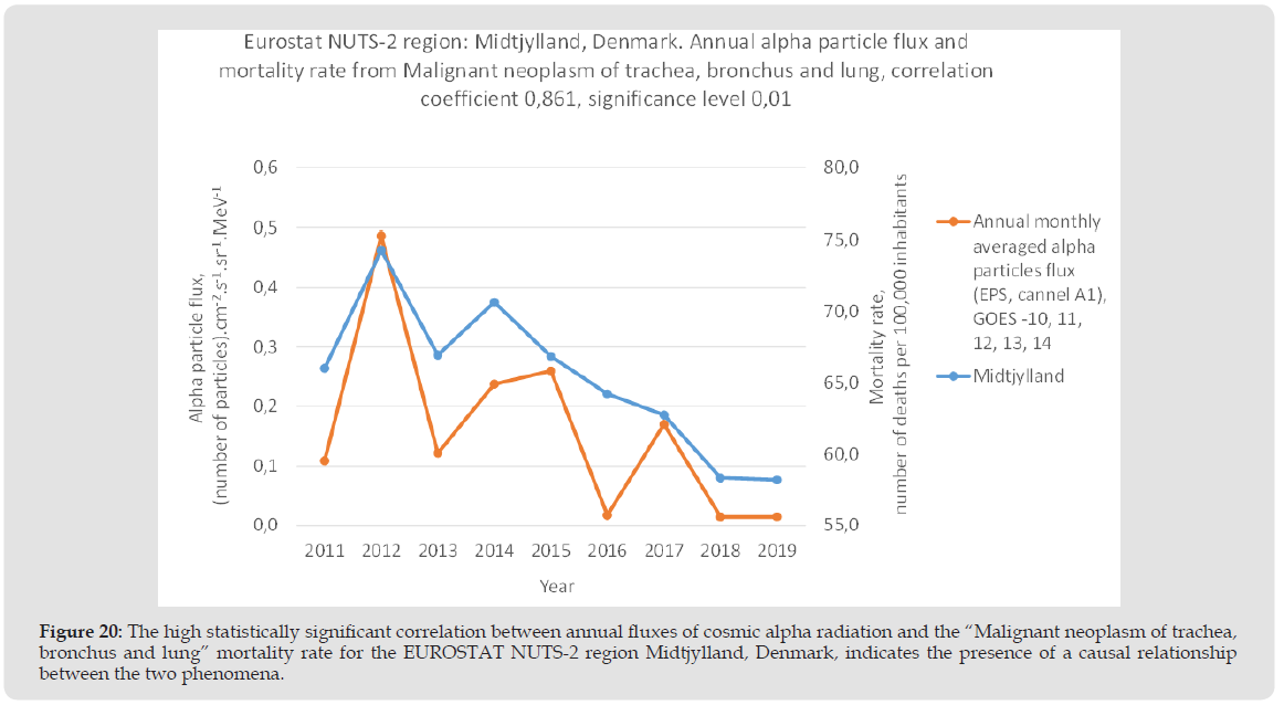 The statistically significant influence of alpha radiation on mortality from “Malignant neoplasm of lip, oral cavity, pharynx” is limited to separate areas covering Central Germany, Romania, and Bulgaria. The 2012 mortality peak and correlation maximum for Romania between annual mortality with annual solar alpha fluxes coincide, indicating that high-energy solar alpha fluxes are causally related to mortality from the mentioned disease in the specified region. Examples of a high correlation between solar alpha radiation annual flux and mortality from “Malignant neoplasm of lip, oral cavity, pharynx”, are shown in Figures 15 & 16. Figure 5 shows the distribution of the mortality rate for the EUROSTAT shortlist death cause „ Malignant neoplasm of larynx” for Europe and the Mediterranean for the studied interval. The statistically significant influence of alpha radiation on mortality from “Malignant neoplasm of larynx” is limited to specific areas covering Southern Britain, Northern Poland, Central Spain, Southern France, Switzerland, and Northern Turkey. The 2012 mortality peak and correlation maximum for Switzerland and Turkiye between annual mortality with annual solar alpha fluxes coincide, indicating that high-energy solar alpha fluxes are causally related to mortality from the mentioned disease in the specified region. Examples of a high correlation between solar alpha radiation annual flux and mortality from “Malignant neoplasm of larynx”, are shown in Figures 17 & 18. Figure 6 shows the distribution of the mortality rate for the EUROSTAT shortlist death cause „ Malignant neoplasm of trachea, bronchus and lung” for Europe and the Mediterranean for the studied interval. The statistically significant influence of alpha radiation on mortality from “Malignant neoplasm of trachea, bronchus and lung” is limited to separate areas covering Northern Britain, Central and Northern Germany, Central Poland, and the Northern Balkans. The 2012 mortality peak and correlation maximum for Central Poland and Northern Balkans between annual mortality with annual solar alpha fluxes coincide, indicating that high-energy solar alpha fluxes are causally related to mortality from the mentioned disease in the specified regions. Examples of a high correlation between solar alpha radiation annual flux and mortality from “Malignant neoplasm of trachea, bronchus and lung” are shown in Figures 19 & 20. Figure 7 shows the distribution of the mortality rate for the EUROSTAT shortlist death cause „Pneumonia” for Europe and the Mediterranean for the studied interval. The statistically significant influence of alpha radiation on mortality from “Pneumonia” is limited to separate areas covering Bulgaria, Portugal, Northern France, and the Balearic Islands. Examples of a high correlation between solar alpha radiation annual flux and mortality from “Pneumonia” are shown in Figures 21 & 22.