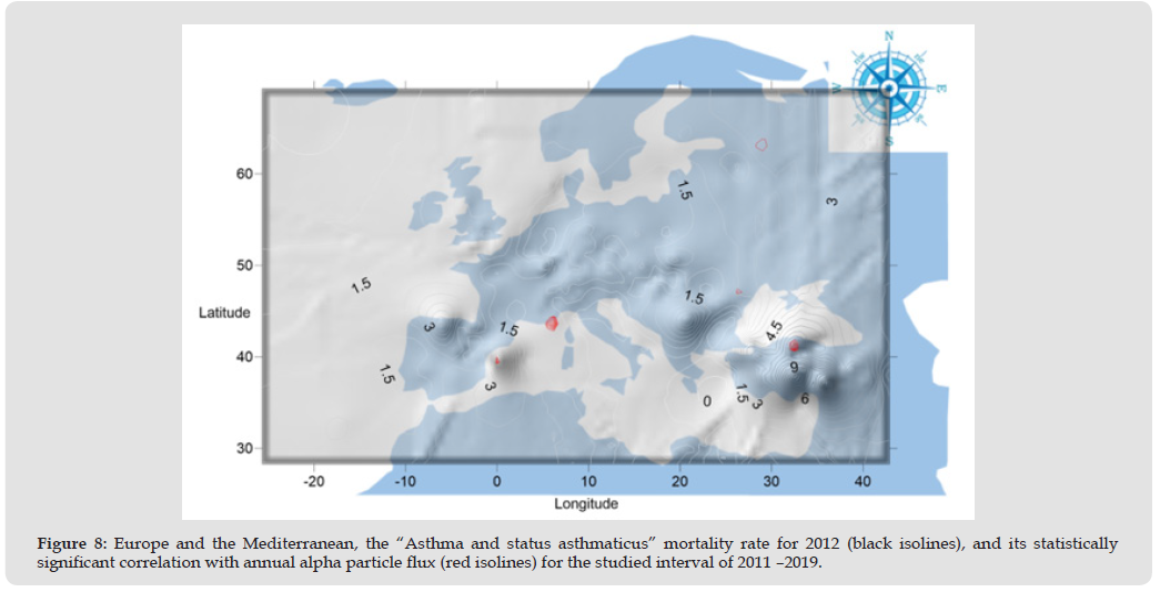 Figure 8 shows the distribution of the mortality rate for the EUROSTAT shortlist death cause „Asthma and status asthmaticus” for Europe and the Mediterranean for the studied interval. The statistically significant influence of alpha radiation on mortality from “Asthma and status asthmaticus” is limited to separate areas covering Northern Turkiye, Southern France, the Balearic Islands, and Belarus. The 2012 mortality peak and correlation maximum for Northern Turkey and the Balearic Islands, between annual mortality and annual solar alpha fluxes, coincide, indicating that high-energy solar alpha fluxes are causally related to mortality from the mentioned disease in the specified regions. Examples of a high correlation between solar alpha radiation annual flux and mortality from “Asthma and status asthmaticus” are shown in Figures 23 & 24.