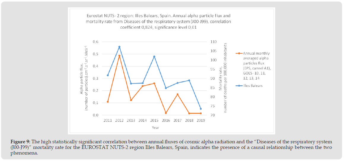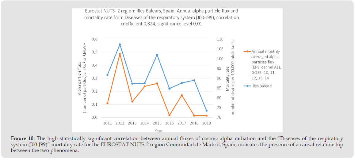 The statistically significant influence of alpha radiation on mortality from “Diseases of the respiratory system (J00-J99)” is limited in Figure 1 mainly to a circular area with a radius of 2°, covering the Western Mediterranean with approximate coordinates of its center, 38° north latitude and 2° east longitude (Balearic Islands, Spain). The impact of alpha radiation covers the mentioned area continuously. Central Spain and Portugal are also affected by radiation. Figures 9 &10 show the time dependence in the interval 2011 – 2019 of two numerical sequences: