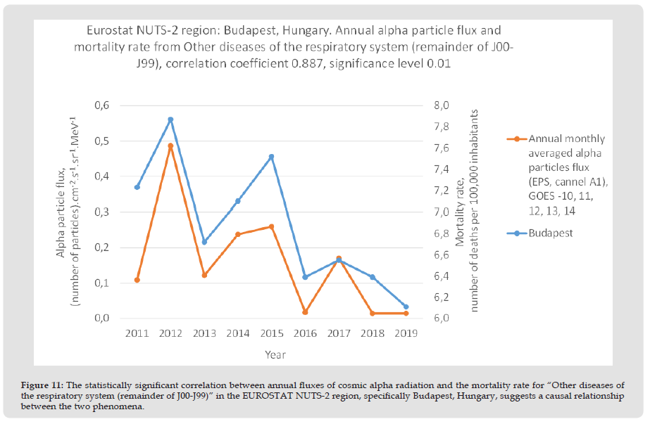 The harmful effects of solar alpha radiation are also observed in many other organs and systems of the human organism, rendering this invisible effect one of humanity’s leading causes of death. The mentioned dangerous phenomenon of cosmic origin is unevenly spread on the planet’s surface. This phenomenon is also observable in several countries from the Northern Hemisphere, including Asia, America, and even Africa [Takuchev, et al. [1,2]]. Europe and the Mediterranean are among the most affected. The European Union has a tradition of maintaining reliable mortality statistics, in which the discussed multifaceted influence of solar alpha radiation on mortality stands out clearly. Below, based on mortality statistics from the European Union, the unexpected association between solar alpha radiation and mortality from respiratory system diseases (ICD-10 codes J00-J99) is illustrated. High-energy alpha radiation can ionize the atoms in living organisms, significantly impairing normal cellular metabolism. This type of radiation may also be the leading external cause of respiratory system diseases.