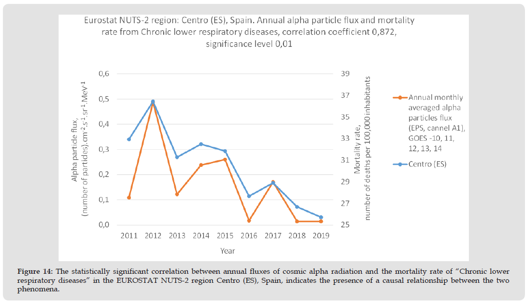 If a stream of high-energy solar alpha particles were to hit the Earth at this time, there would be no deflecting magnetic force on them, making it easier to reach the Earth’s surface. The multifaceted harmful effects of invading alpha particles on the human body can explain the so-called disease clusters, groups of diseases with an unclear relationship between them, which are often diagnosed in some patients. Visca, et al. [11] draw attention to the fact that patients with respiratory diseases often have diabetes mellitus, and the relationship between these diseases is unclear. The relationship between diabetes mellitus and solar alpha particle fluxes is discussed in Takuchev, et al. [2,12]. Carter, et al. [13] found a link between respiratory and cardiovascular diseases, but found that the relationship between them remains unclear (the relationship of cardiovascular diseases to solar alpha particle fluxes is discussed in Takuchev, et al. [1,9,10,14-35].