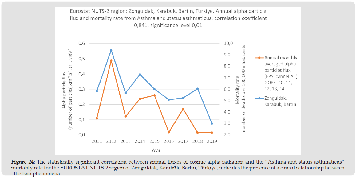 The moment of occurrence of a fast alpha particle stream cannot be predicted, but the dates of increased risk for a given point on the Earth’s surface between 30°N – 50°N can be calculated by the location’s latitude (Takuchev [9]). For example, for the EUROSTAT NUTS-2 Zonguldak, Karabük, Bartın, Turkiye (See Figure 24), with a latitude of 41.0°N, the dates with maximum risk are April 6th and September 3rd. On these dates, the inclination (56.7°) of the geomagnetic vector for the Zonguldak, Karabük, Bartın, is close in magnitude to or coincides with the culmination of the Sun (the Earth’s atmosphere is thinnest at the moment of the Sun’s culmination, and there is no deflecting magnetic force for alpha particles if they intrude at this time from the Sun). The increased risk of health incidents outdoors around local noon is a further argument in favor of the healthfulness of the indoor midday break (‘siesta’) practiced in Mediterranean countries. The above arguments reveal a new, previously unsuspected cosmic cause of mortality from respiratory system diseases – solar corpuscular alpha radiation. This type of radiation may be the hidden cause of many deadly diseases. The risk is highest for inhabitants in the mountainous regions. During the day, the hours around local noon are the most hazardous for a cosmic impact, potentially leading to subsequent illness. The risk is also increased on certain days of the year (depending on the latitude of the observation point), when the solar culmination coincides with the angle of the geomagnetic vector (inclination).