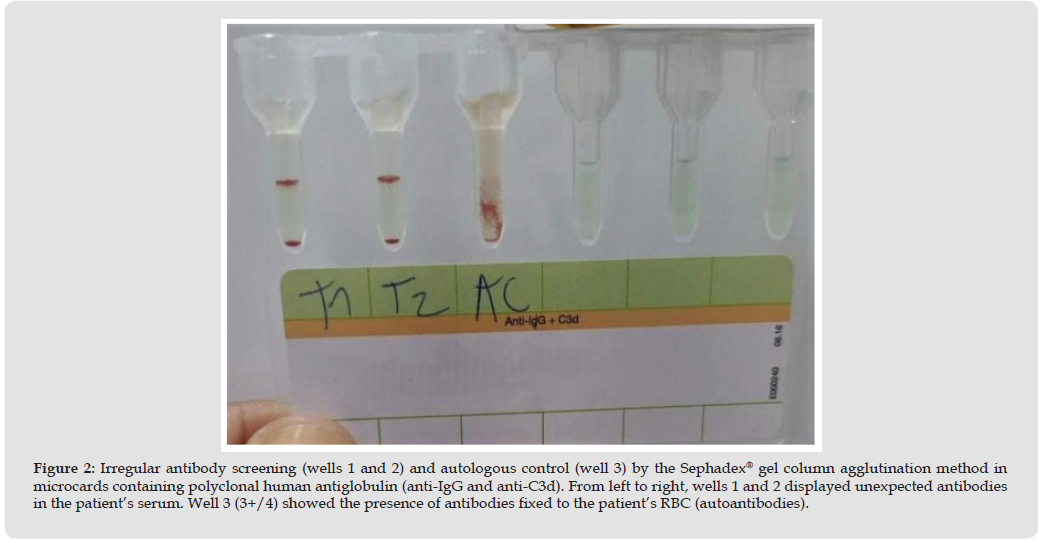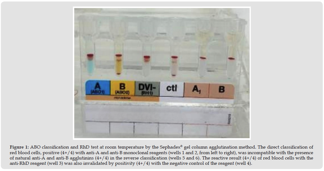 A 64-year-old woman was admitted for surgery due to a pancreatic neoplasia. Reserve of packed red blood cells (PRBC) was requested. Blood samples were tested by the Sephadex® gel column agglutination method (Johnson ST, et al. [2]).