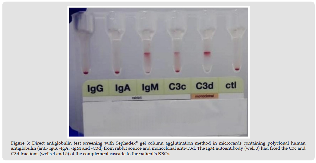 CAS is characterized by spontaneous erythrocyte agglutination associated with accelerated destruction of red blood cells by the immune system. CAS is generally associated with autoimmune diseases and lymphoproliferative neoplasms and is very rare in solid tumors. The diagnosis of autoimmune haemolytic anaemia (AIHA) is based on clinical or laboratory evidence of hemolytic anemia and the detection of autoantibodies, specifically IgM, with a positive C3 direct antiglobulin test (DAT) and the presence of circulating cold agglutinins in the serum. Due to the excess of circulating free antibodies, an ABO blood group discrepancy may be observed.