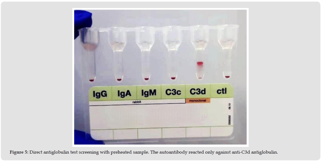 The initial sample at room temperature showed discrepancies in the ABO blood group classification (Figure 1). The irregular antibody screening (IAS) and autologous control were positive (Figure 2). The identification of the irregular antibody with a standard cell panel and autologous RBC determined its reactivity with all the red blood cells tested. The agglutinin titer was 1024 (data not shown). The DAT screening was positive for anti-IgM, -C3c, and -C3d (Figure 3). Despite the laboratory findings, the patient did not present any clinical manifestations of CAS. Preheating a new sample and further testing at 37°C revealed blood group A RhD positive (Figure 4). IAS was negative, and DAT was reactive only with anti-C3d (Figure 5). Using the same heating method at 37°C, compatible RBCs were found (Figure 6). The tumor was considered inoperable. The patient progressed without treatment and specific clinical symptoms of CAS, despite worsening anemia (Hb=6.8g/dL) and of the immunohematological profile. He died 7 months after diagnosis.