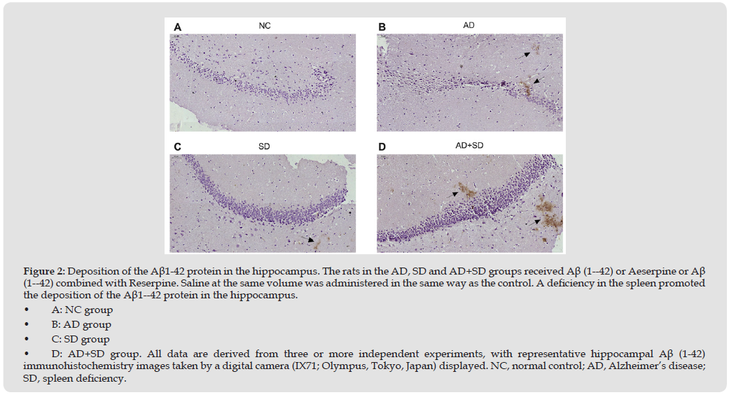 Spleen Deficiency Induction and Behavioral Effects Rats in the SD group exhibited lethargy, piloerection, and curling behavior. The average spleen deficiency score (17.6 ± 1.939) was significantly higher than in NC rats (5.9 ± 0.5831, Figure 1A, p < 0.01). AD+SD rats showed similar symptoms, while AD rats appeared normal. Spleen deficiency scores differed significantly among groups (Figure 1A, p < 0.01), confirming successful model induction. In the MWM test, all groups showed reduced escape latency over five training days. However, D rats displayed significantly prolonged latency on day 5, along with decreased target quadrant distance, duration, speed, and platform crossings (Figures 1C-1G, p < 0.05). AD rats also showed impaired performance compared to NC rats (Figures 1C-1G, p < 0.05). The AD+SD group exhibited the most severe cognitive deficits (Figures 1C-1G, p < 0.05), indicating that spleen deficiency exacerbates AD-like behavior. Aβ Deposition in the Hippocampus Minimal Aβ deposition was observed in the hippocampus of AD and SD rats, whereas AD+SD rats showed pronounced Aβ plaque accumulation in the CA1 region, suggesting that spleen deficiency accelerates AD pathology (Figure 2).