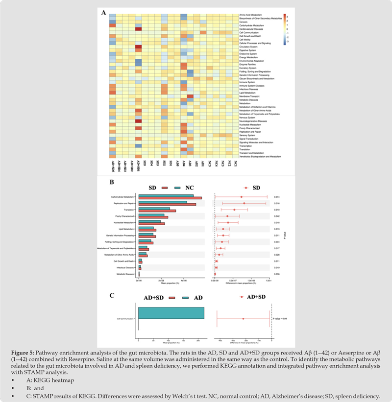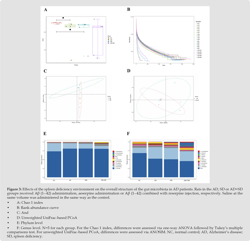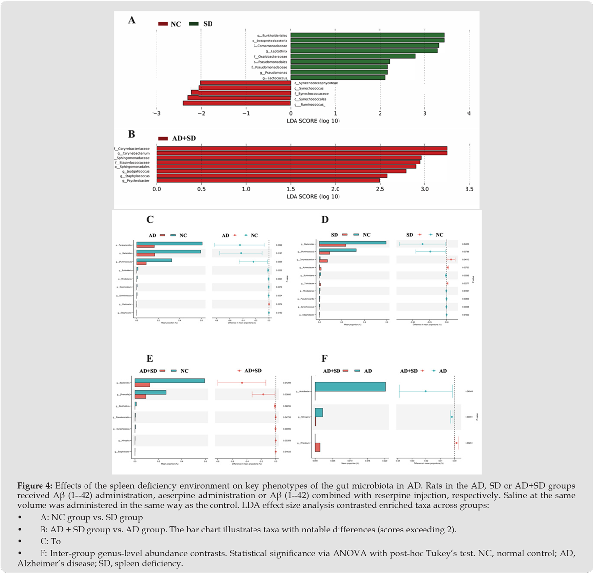 Moreover, spleen deficiency appeared to exacerbate AD progression, as rats subjected to both reserpine and Aβ1–42 exhibited more severe cognitive decline and hippocampal damage compared to those receiving either treatment alone. These findings imply that a spleen-deficient internal environment may serve as a key pathogenic factor in the development of AD. In recent years, numerous studies have highlighted the role of intestinal flora as a key communicative interface between the gut and the brain—a relationship termed the brain-gut axis [4-6]. Growing evidence further suggests a strong association between gut microbiota dysbiosis and the pathogenesis of Alzheimer’s disease (AD), making microbiota modulation an attractive target for AD prevention and treatment [29]. Although alpha and beta diversity analyses in our study did not reveal significant overall structural differences between groups, more refined LEfSe and LDA analyses identified several taxa with altered abundance that have previously been linked to AD. Notably, Proteobacteria and Actinobacteria— both implicated in neuroinflammation—were enriched under pathological conditions. Lipopolysaccharide (LPS), a major component of the Proteobacterial cell wall and a potent endotoxin, has been detected in hippocampal and supratemporal neocortical lysates from AD patients [30]. LPS levels are reported to be 26-fold higher in AD patients than in healthy controls [30], and have been shown to promote neuroinflammation [31].