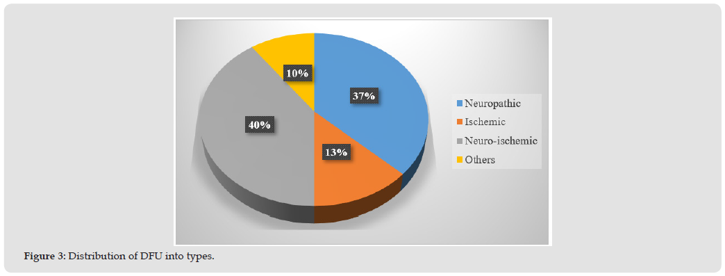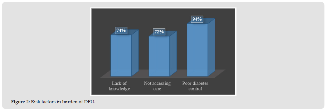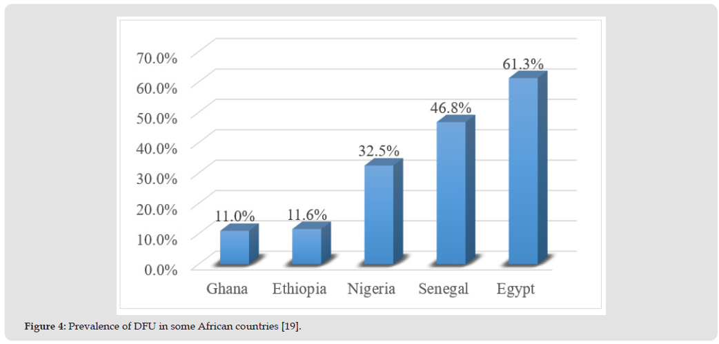Nigeria bears the highest burden of diabetes prevalence in Sub-Saharan Africa. It is estimated that someone with diabetes has 20% chance of developing DFU in his or her life time [5]. It is also estimated that 2.5% of persons with diabetes would develop DFU every year [10], while amputations and mortality rate could be higher (Figure 1). There is variations in reported DFU amputation rate; and figure show 35% as report from Southern Nigeria, which is much lower than the speculated 80% from United States [11], but higher than the 24% report from Northern Nigeria [10]. Further, Ugwu, et al. [5] reported the risk factors contributing to DFUs may include poor glycemic control, lack of care knowledge, and delayed or no hospital presentation (Figure 2), as well as the types of ulcer (Figure 3). Figures 2 & 3 recognize the fact that risk factors, including but not limited to neurological and vascular phenomena, contribute to the burden of DFU [11-14]. It was concluded that the major challenges of DFU management in Nigeria is delayed hospital presentation [5]. This assertion is supported by yet another report from neighbouring Delta State in Nigeria that even some people who have free medical care are involved in the delayed presentation at hospital [15]. However, limited access to specialized care and inadequate foot care education may also contribute to poor outcome [6]. To effectively address this challenge, patient-centre approaches is needed to effectively handle diabetic issues/ complication within our society [16].