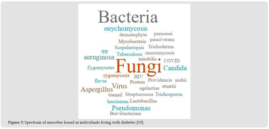 This is with a focused view to determine knowledge and practice of diagnostic pathology and PHC services. Literature search methods followed the scoping review design, albeit cursory without the conventional PRISMA. Search platforms included PubMed and Google Scholar, as well as diabetes atlas of the International Diabetes Federation. Inclusions criteria were diabetes and empirical infections. In the quick scoping review on PubMed, 14 eligible articles indicated a spectrum of common and uncommon infectious microbes [27-40], which are not limited to wounds but also in blood, foot and sinuses. 2/14 (14.28%) articles include diabetic foot cases, and both indicate oncomychosis [29,30]. It has been known that major infections common among with diabetes include bacteria, fungi and virus [21]. Therefore, Figure 5 expounds on the knowledge of diabetes infections, especially to emphasize fungi and uncommon infectious agents.