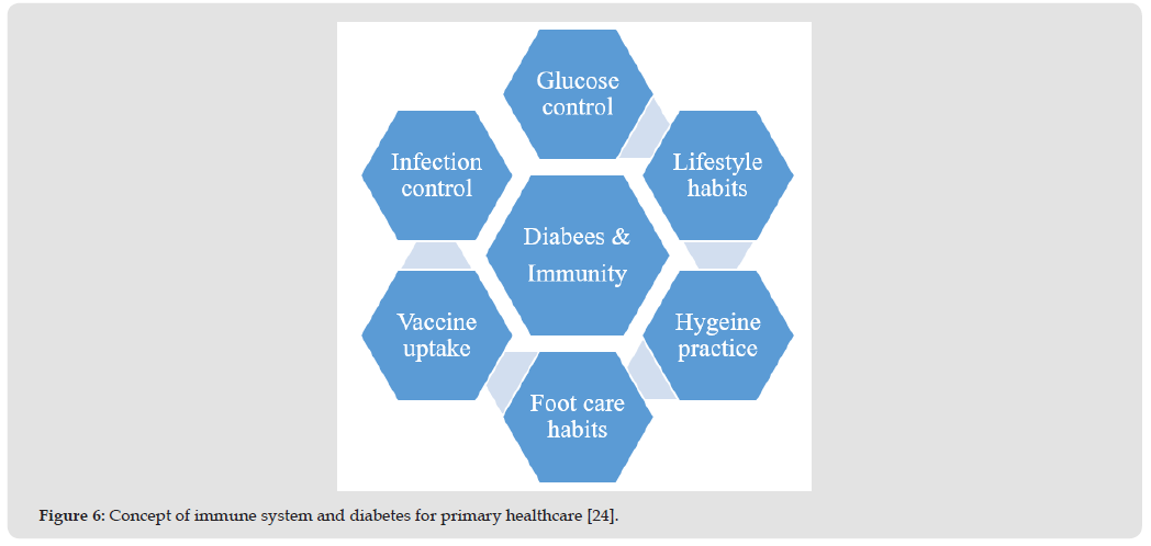 The primary healthcare service is generally focused on educational health promotion, preventive medicine and treatment [41]. The concepts of health promotion and preventive medicine are most often interwoven around the impact of diabetes on immune system functions (Figure 6). However, the empirical data could be assessed to monitor the activities and achievements (Table 2). Several studies and clinical trials have shown the importance of dietary patterns, food, and nutrition in the prevention and management of T2DM. The quality of food (dietary fat and carbohydrate) consumed is more important than the quantity of these macronutrients. Food rich in vegetables, legumes, fruits, nuts and whole grains, moderate alcohol consumption, and extremely low in refined grains, red and processed meat, sugary and sweetening food products have shown to reduce the risk of diabetes and improve glycemic control and blood lipids in diabetes patients. Global health policies are made across several sectors in different countries to create healthful food environment / outcome. This is geared towards a corporate social responsibility to ensure food safety. Such crucial strategies include nutritional and agricultural policies that are in favors of production and distribution of healthy food (Lay, et al. 2014). The prevention and management of diabetes in Nigeria will require the collaboration of the government and the health sector to succeed.