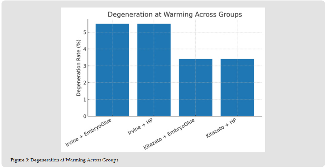 EmbryoGlue conferred a consistent improvement in blastocyst utilization across both vitrification systems, without adversely affecting fertilization or survival. Table 1 shows fertilization rates, blastocyst development, and degeneration at warming across groups. EmbryoGlue groups consistently outperformed HP controls, particularly in blastocyst yield (Figures 1-3).