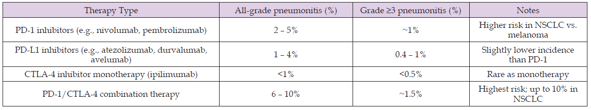 The incidence of ICI-related pneumonitis (CIP) depends on the ICI-agent and its respective regimen. PD-1 inhibitors such as nivolumab and pembrolizumab are associated with all-grade pneumonitis in ~2–5% of patients, with grade ≥3 events in ~1% [1,2]. PD-L1 inhibitors carry a slightly lower risk (1–4%), whereas CTLA-4 monotherapy rarely causes pneumonitis (<1%). Combination regimens, particularly PD-1 plus CTLA-4, have the highest risk (6–10% overall; ~1.5% severe) of CIP [2,3]. Real-world series suggest higher incidences (5– 12%), particularly among patients with lung cancer or pre-existing interstitial lung disease [4]. Additional risk factors include prior thoracic radiation, smoking history, and chronic obstructive pulmonary disease.