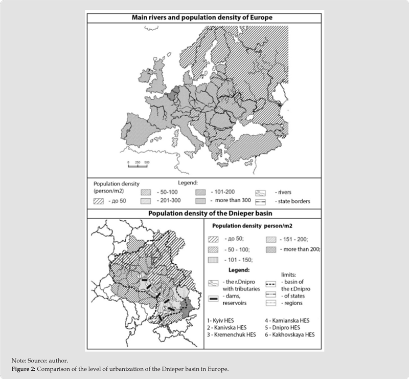 - Dnipro Basin: has a high level of urbanization and population density, with over 32 million people (almost 75% of the country’s population) [6]. Key agglomerations: Kyiv, Dnipro, Zaporizhzhia, Kremenchuk, Cherkasy. The illustrations reflect the importance of the Dnipro River basin and a comparison of the level of urbanization of the Dnipro basin in Europe (Figures 1 & 2).