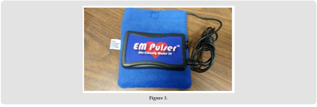Therefore, IRI followed his design years ago and perfected the EM Pulser 78 with a 7.8 Hertz pulse rate that Dr. Gordon recommended, based on the earth’s Schumann Resonance and the brain’s alpha rhythm. It also has a nanosecond rise time as well, which has satisfied over 1000 clients who use the affordable electrotherapeutic product www.BioenergyDevice.org. Since NASA found that a wrap-around pad was also helpful for joints, to stimulate new cartilage growth, IRI produced an attachment called the “PulsePad” (see photo on left) years ago, which is a 4” x 6” pad specially designed with a flexible, pancake coil to produce the same 7.8 Hz magnetic PEMF in the pad, similar to but smaller than NASA’s wrap-around pad, and can be placed under clothing, powered by the EM Pulser secured to one’s belt with convenient, built-in belt loops (Figure 3).