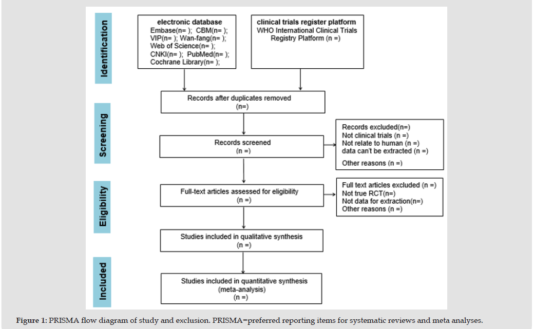 We will use Express Version 3.2 for document management. Duplicate documents will be deleted with this software. Two reviewers (Chao Liu and Jin Zhou) will screen the titles and abstracts and removed irrelevant articles independently according to the above inclusion and exclusion criteria. For the data in question, we will resolve it by contacting the first author or corresponding author for the full text and deciding whether to include or not, and record the reasons for all excluded studies. The chart for this study is shown in Figure 1.