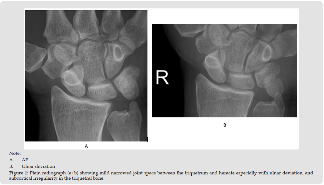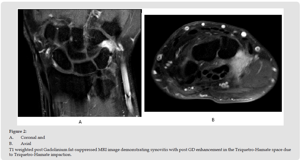 A 47-year-old right-hand dominant male social worker presented with persistent pain localized to the ulnar aspect of the wrist, without any preceding trauma. Initial evaluation by physical examination inspection revealed no swelling or deformity of the wrist. There was tenderness localized over the fovea region. Pain was elicited during passive dorsiflexion and ulnar deviation; no tenderness or prominence was noted over the ulnar head. The piano key sign was negative. The press test and synergy test were also negative. The range of motion was full with no limitation or pain, grip hand did not provoke any pain. Standard wrist radiographs (Figure 1) showed mild narrowed joint space between the triquetrum and hamate especially with ulnar deviation, and subcortical irregularity in the triquetral bone, but no fractures or dislocations. MRI imaging (Figure 2) demonstrated synovitis with post GD enhancement in the Triquetro-Hamate space due to Triquetro-Hamate impaction. Collaborative assessment by a hand orthopedic specialist and a musculoskeletal radiologist led to a conclusive diagnosis of Triquetrohamate Impaction Syndrome. The orthopedic surgeon did a corticosteroid injection in the Triquetro- hamate space with good results.