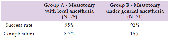 Among 150 patients, 79 had meatotomy under local anesthesia and 71 had Meatotomy under general anesthesia. The median age in both groups was 6 years, the average follow up period was approximately 3 months. Group A (Local Anesthesia), 95% success rate, 3 (3.7%) patients had bleeding that stops with compression. Group B (General Anesthesia) The success rate was 92%, Moreover the complication rate was 15% (bleeding in 11 patients which managed with meatoplasty) (Table 1). 4 patients had Persistent Symptoms in group A compared to 6 patients in group B (5% to 8%). Those patients had to do a uroflometry study, after 2 months of their last visit to the pediatric urology clinic (Table 2).