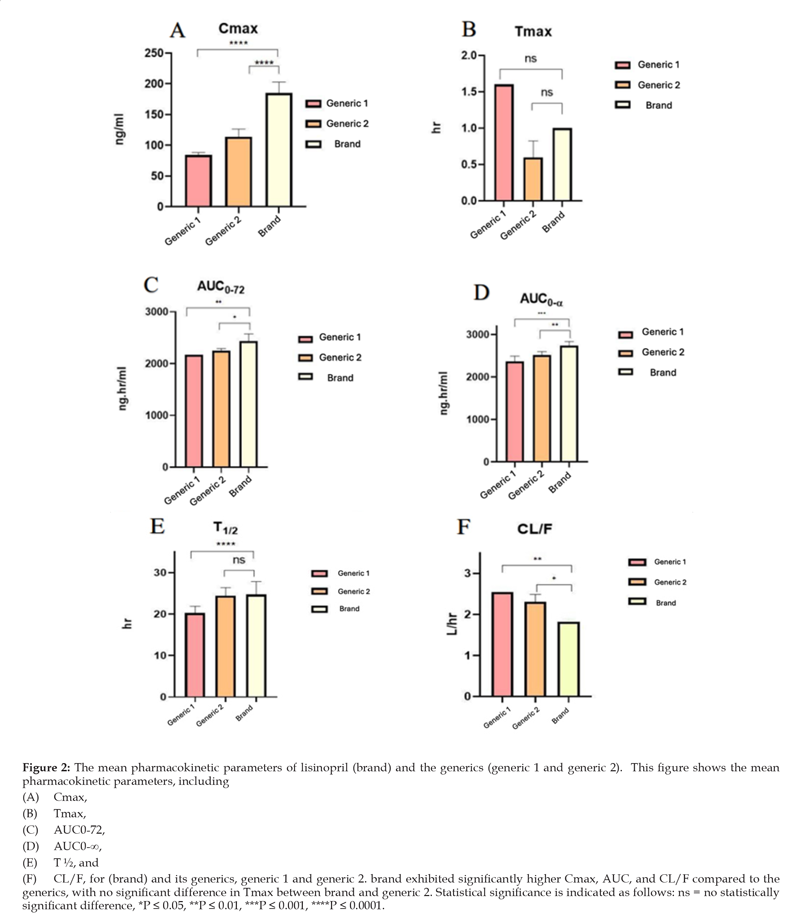 In contrast, generic 1 and generic 2 showed a reduction of 50% in Cmax compared to brand, which is a statistically significant difference between the lisinopril brand and generics. For Tmax, the time taken to reach Cmax, brand and generic 2 showed similar values, and based on the data, no statistically significant difference was found between them. For other pharmacokinetic parameters such as AUC0-72, AUC0- ∞, and CL/F, brand exhibited a high statistically significant difference when compared to the generic forms [3]. Pharmacokinetic parameters are represented in Figure 2.