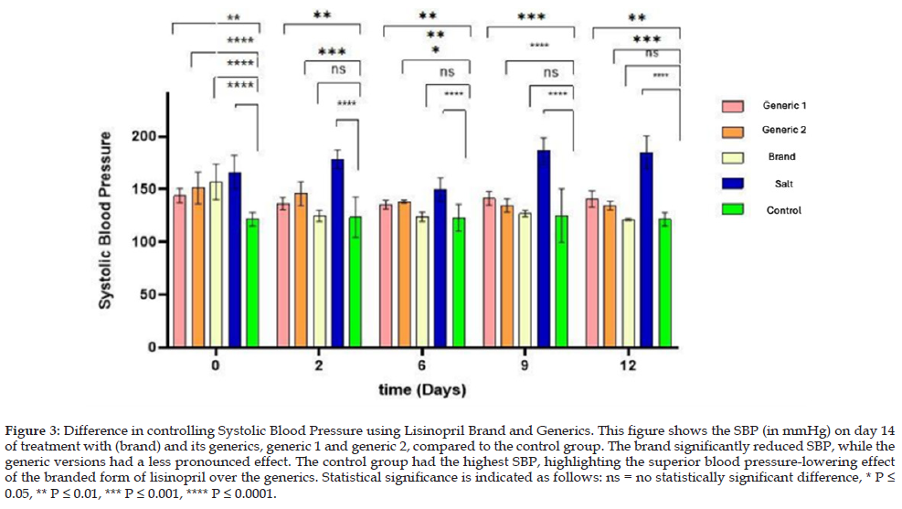 The significance of our research lies in the finding that brand was statistically significant in controlling rats’ blood pressure within the two-week treatment duration, with no significant effect on increasing liver and cardiac enzymes. Brand was more effective in reducing systolic blood pressure compared to the generics 1 and 2 after two weeks of treatment. Moreover, brand demonstrated greater safety concerning kidney and heart function, as evidenced by the pharmacokinetic studies.