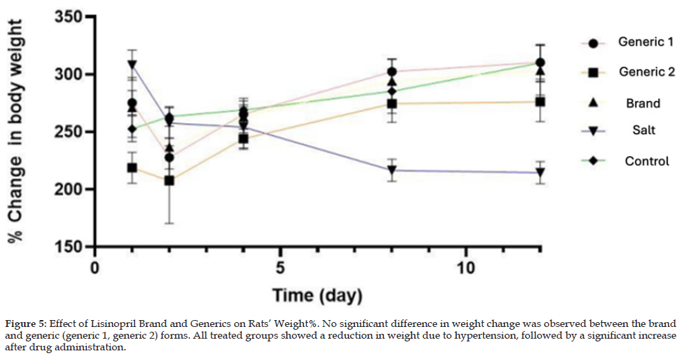 Figure 5 shows that there was no statistically significant difference in the weight changes between the branded and generic lisinopril groups. Despite developing hypertension, all treated groups showed a significant increase in body weight after the treatment. This suggests that while hypertension was induced, lisinopril (regardless of the form) did not significantly affect weight gain.