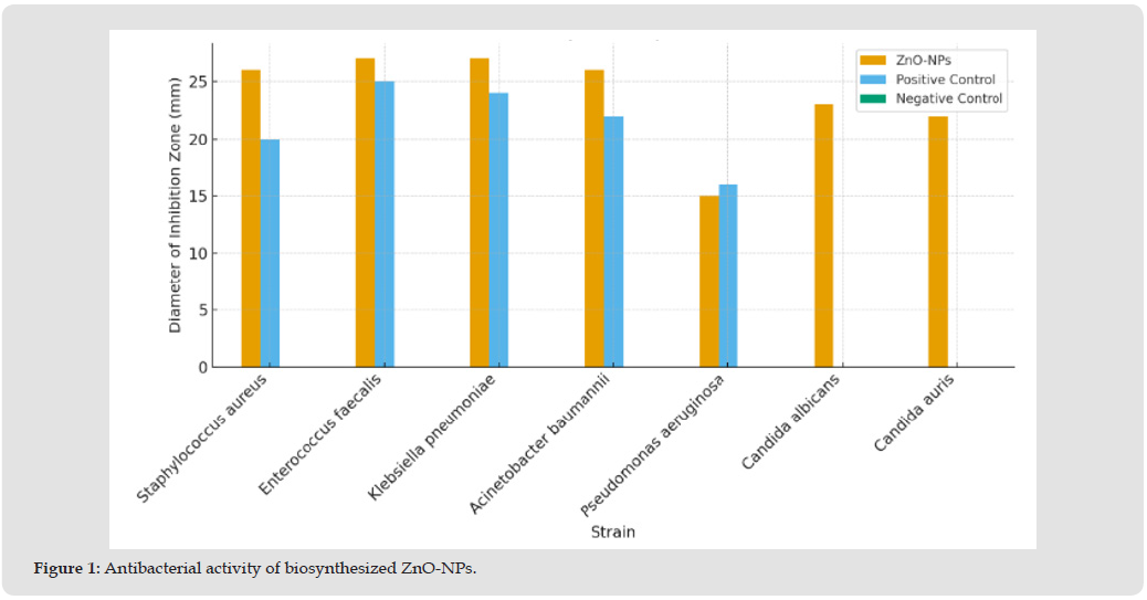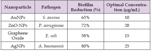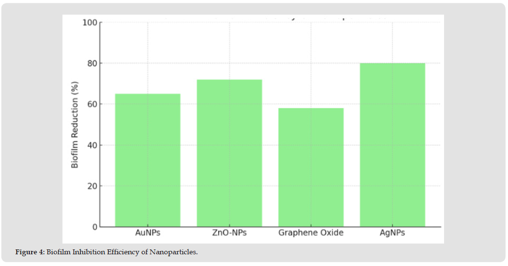 The escalating global threat of antimicrobial resistance (AMR) necessitates the exploration of novel therapeutic strategies that transcend conventional antibiotics. Nanotechnology offers a promising frontier in this endeavor due to its unique ability to interact with microbial cells at the molecular level, circumventing classical resistance mechanisms. This study provides further evidence that silver nanoparticles synthesized through green chemistry routes exhibit potent and broad-spectrum antimicrobial activity. Although silver nanoparticles (AgNPs) continue to be the most comprehensively studied, growing interest has emerged in alternative nanomaterials— such as gold nanoparticles (AuNPs), zinc oxide nanoparticles (ZnONPs), and polymer-based nanoparticles—owing to their improved selectivity, lower cytotoxicity, and potential synergism with conventional antimicrobial agents (Table 2 & Figure 4). The mechanism of antibacterial action of AgNPs involves multiple, synergistic pathways. Upon contact with bacterial cells, AgNPs adhere to the cell membrane through electrostatic interactions, leading to increased permeability and leakage of intracellular components [12]. The subsequent penetration of nanoparticles facilitates the generation of reactive oxygen species (ROS), including hydroxyl radicals and superoxide anions, which induce oxidative stress and DNA damage. Furthermore, Ag⁺ ions released from the nanoparticle surface interact with thiol groups of membrane-bound enzymes, impairing vital metabolic processes and disrupting cellular respiration [13].