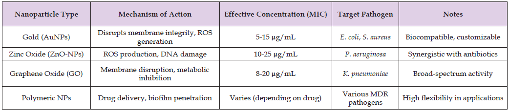 Biologically derived nanoparticles often exhibit enhanced stability, tunable morphology, and superior biocompatibility compared to those synthesized by chemical or physical methods. A wide variety of biological systems—fungi, bacteria, and yeast—have been successfully employed in the sustainable synthesis of metal and metal oxide nanoparticles [1]. Antimicrobial resistance (AMR) represents one of the most pressing global health challenges of the twenty-first century, undermining decades of progress in infectious disease control. The misuse and overuse of antibiotics, coupled with the ability of pathogens to form protective biofilms, have significantly contributed to the resilience of microbial communities against conventional therapies. Nanoparticles, owing to their diverse physicochemical and biological properties, have emerged as promising agents for overcoming AMR. While silver nanoparticles (AgNPs) remain the most extensively investigated, alternative nanomaterials—including gold nanoparticles (AuNPs), zinc oxide nanoparticles (ZnO-NPs), and polymeric nanoparticles— are gaining increasing attention due to their enhanced selectivity, reduced toxicity, and potential synergistic effects with existing antimicrobial agents [6-8]. This study focuses on these emerging nanotechnologies, their mechanisms of antimicrobial action, and their implications for future therapeutic applications beyond silver-based systems (Table 1).