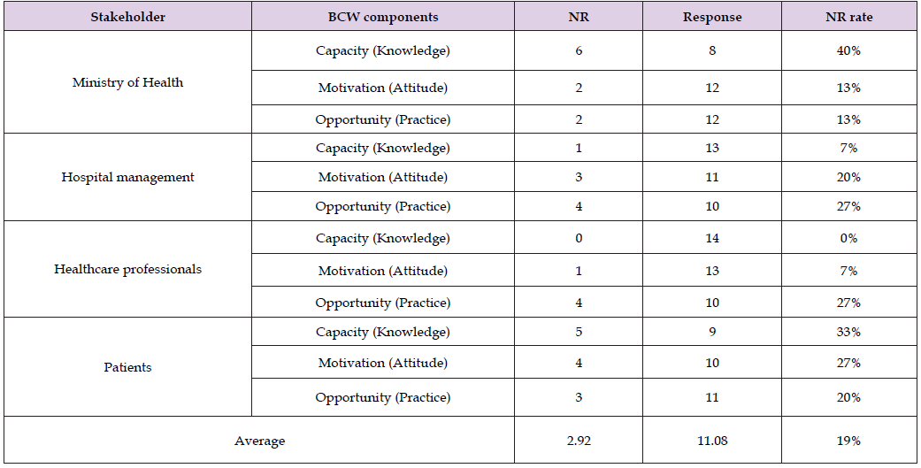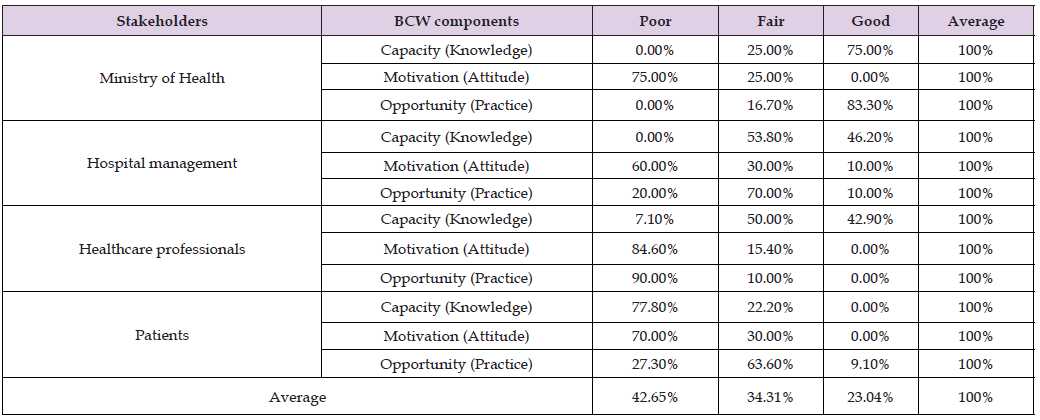 In the survey, there were 15 respondents comprising 64.3% males and 35.7% females. However, it is observed that none of the questions received 100% responses. The non-responses (NR) in the survey averaged 19% (Table 2). Responses to the various questions varied for the different stakeholders, but the perceptions are generally poor (Table 3). Overall, 59% of respondents indicate less than good level of capacity, while poor motivation and opportunity are indicated by 97.5% and 75% of responses, respectively; with motivation/ attitude being lowest (Figure 1). In the naturalistic observational evaluation among the six organizations (Table 4), EBGH and NHC are deemed to have similar behavioural traits. The remaining four were found to exhibit varied distributions in types of behavior (Table 5). A further critical review revealed that Donak Hospital recorded the highest overall score, followed by CMHS.