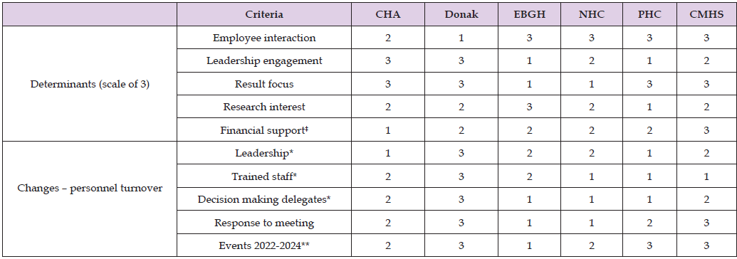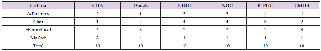 On the second objective, it is observed that Donak hospital has the highest summative score, followed by CMHS. It is also observed that EBGH and NHC, closely followed by PHC have the lowest behavioural traits. It is noteworthy that on one hand, Donak hospital and the CMHS are similarly rated for hierarchical behaviour but opposite in terms of clan and market focus, while EBGH, NHC and PHC are very closely rated to possess the same distribution of behavioural characteristics. It is inferred from the observation that while no single organizational behavioural trait may determine potential to support sustainability of diabetes self-management outreach program, the hierarchical trait could be positive, while adhocracy and clan traits would be the opposite. It has been known that behavioural and economic factors influence the success of collaborative relationships between organizations [24]. Organizational behaviour is underpinned by the cultural perspectives of the institution, which is influenced by external and internal factors. The external factors are environmental forces beyond the organization’s control e.g., economy, politics, and technology [25]. Internal factors include broad range of determinants that make or mar a project such as employee interactions, leadership and result orientation amongst others [25-27]. Organizational changes and culture are very associated with each other, and these influences staff turn-over [27].