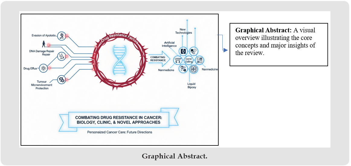 These clinical situations, being the underlying causes, thus indicate the need for the implementation of a comprehensive platform to better understand the resistance mechanisms and facilitate the development of countermeasures [10]. This article broadly discusses cancer drug resistance, starting from the differences between acquired and intrinsic resistance types. Firstly, we discuss cellular and molecular factors relevant to this purpose, including DNA repair, cancer stem cells, apoptotic evasion, efflux pumps, epigenetic regulation, and the role of the tumour microenvironment. In this context, resistance is dramatically illustrated for various types of therapy, demonstrating how cancer cells develop resistance to chemotherapeutics, targeted drugs, hormonal agents, and immunotherapeutic. We also consider the clinical aspects of resistance by examining the evolution of cancer and the failure of treatment, as well as evaluating new treatments aimed at addressing the problem, such as combination therapies, nanomedicine, and precision oncology [11]. Moreover, we discuss advanced and futuristic concepts that may serve as catalysts for the drug-resistance struggle to transition into a new era, including CRISPR technologies, liquid biopsy-based monitoring, and artificial intelligence- driven drug design. This review outlines the drug resistance landscape in cancer by adeptly intertwining mechanistic insights with translational advancements, making it a valuable resource for scientists, clinicians, and students committed to solving one of the most intractable issues in oncology today