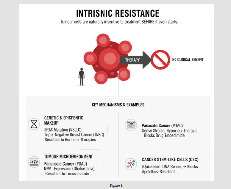 Generally, patients with unmethylated MGMT promoters and actively expressed MGMT are not good candidates for temozolomide treatment. Whereas those with promoter methylation resulting in suppressed MGMT expression tend to have the most favorable treatment outcomes. Apart from genetics, both phenotypic and microenvironmental factors contribute to intrinsic resistance. For example, the poor vascularization, desmoplastic stroma, and hypoxic microenvironment of pancreatic ductal adenocarcinoma (PDAC) not only limit drug delivery but also serve as a refuge for the resistant tumour cells, hence they make PDAC very resistant to both chemotherapy and targeted therapy [18]. The situation may also be comparable with that of stem-like cancer cells (CSCs) at the baseline, which are capable of rendering tumors less sensitive naturally. CSCs are non-dividing. they possess extremely efficient DNA repair mechanisms and are resistant to apoptosis as shown in Figure 1, allowing them to survive treatments that primarily target proliferating cells [19]. Hence, intrinsic resistance remains a significant barrier to the benefits of frontline therapies for certain patient cohorts. This thus points to a greater extent to the necessity of predictive biomarkers for detecting therapy- resistant tumors prior to treatment, as well as the therapeutic strategies guided by them as alternatives [20].