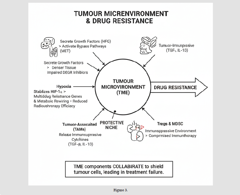 The tumour microenvironment is one of the major factors that significantly impact drug resistance. Fibroblasts, immune cells, the extracellular matrix, and vasculature of the TME cooperate to form a protective niche that shields tumour cells from treatment. Growth factors such as hepatocyte growth factor (HGF), which is secreted by cancer-associated fibroblasts (CAFs), not only activate bypass signalling pathways like MET but also lead to resistance to EGFR inhibitors. As it has been discovered in pancreatic cancer, CAFs also produce extracellular matrix components, which thicken tissue and make drug absorption more difficult [44]. Solid tumors often suffer from hypoxia, and thus, resistance is amplified by the stabilization of hypoxia-inducible factor 1α (HIF-1α), which causes the expression of genes related to multidrug resistance and alters cellular metabolism to favour glycolysis. Since radiotherapy relies on oxygen to produce free radicals that damage DNA, hypoxia also lowers its effect. Immune cells that are present in the TME also contribute to resistance. Tumour-associated macrophages (TAMs), by secreting cytokines like TGF-β and IL-10, which suppress immune surveillance and increase tumour cell survival, can facilitate chemoresistance. Besides this, regulatory T cells (Tregs) and myeloid-derived suppressor cells (MDSCs), as shown in Figure 3 constitute an immunosuppressive milieu which lessens the effect of immunotherapy [45].