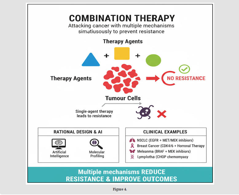 Combination therapy is the most popular method of overcoming resistance. It works by attacking cancer cells using multiple mechanisms simultaneously, which reduces the likelihood that resistant clones will survive, as shown in Figure 4. Combinations in clinical oncology may include immunotherapy plus targeted therapy, chemotherapy plus targeted therapy, chemotherapy plus chemotherapy, or targeted therapy plus targeted therapy. NSCLC, or non-small cell lung cancer, is a notable example. Single-agent EGFR tyrosine kinase inhibitors (TKIs) often yield dramatic but transient effects, and resistance typically develops due to MET amplification or EGFR T790M mutations [61]. Resistance may be delayed by combining EGFR inhibitors with MET or MEK inhibitors. Comparably, by inhibiting bypass MAPK signalling, the combination of BRAF inhibitors (vemurafenib, dabrafenib) and MEK inhibitors (trametinib, cobimetinib) in melanoma considerably increases progression-free and overall survival when compared to BRAF inhibitor monotherapy. Although chemotherapy combinations are older, they remain useful. To prevent tumour cells from developing cross-resistance, multi-agent regimens such as FOLFOX/FOLFIRI for colorectal cancer or CHOP (cyclophosphamide, doxorubicin, vincristine, and prednisone) for lymphomas rely on agents with distinct mechanisms of action.