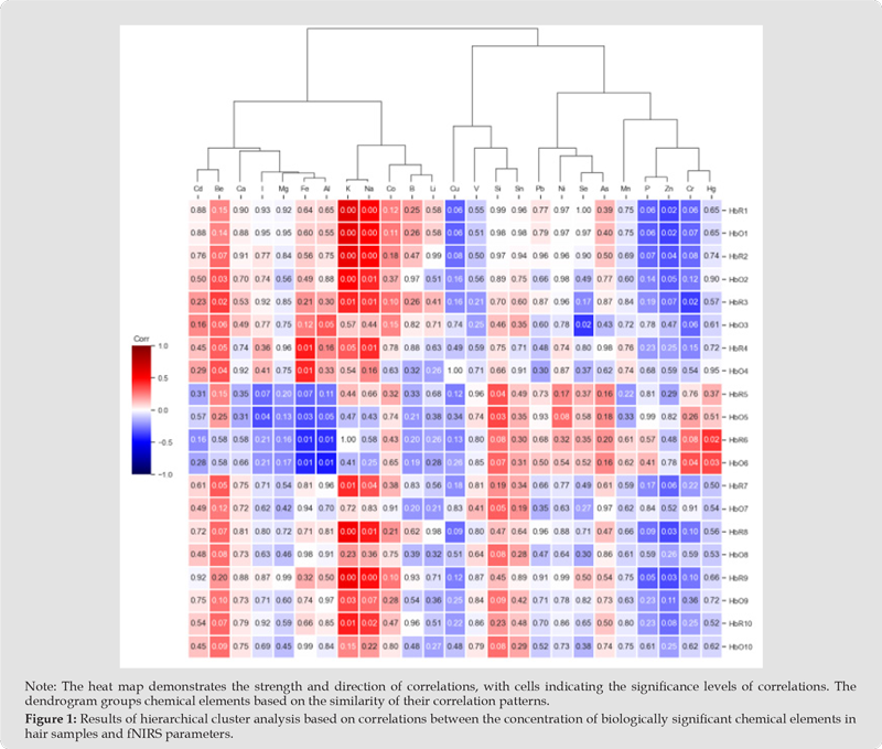 To assess brain activity, the Cortivision Poton Cap C20 device (Cortivision, Poland) was used. The device is certified and complies with the requirements of the technical regulations of the Eurasian Economic Union (EAEU N RU D-PL.RA03.B.20841/21 dated 03.12.2021, valid until 02.12.2026). The Cortivision Poton Cap C20 is equipped with 20 optodes (10 sources and 10 detectors) with a sampling frequency of 7.8125 Hz. The optodes are non-invasively fixed to the subject’s head using an elastic cap “Easycap”. The optode distribution scheme was developed in our own previously conducted study [11]. In this case, 8 pairs of optodes were placed according to the international 10-20 system in the frontal, parietal, temporal and occipital regions in the left and right hemispheres (F3 and F4; P3 and P4; T7 and T8; O1 and O2, respectively); another 2 pairs of optodes were placed to study the prefrontal cortex (AF3 and AF4) (Table 1). The fNIRS study was performed for 30 seconds, with subjects sitting in a comfortable position with their eyes open. For subsequent data analysis, the arithmetic mean values of the concentrations of oxygenated (HbO) and deoxygenated (HbR) hemoglobin (mmol/l) were taken into account. During the statistical data analysis stage, Pearson’s r-correlation coefficients were calculated between fNIRS parameters and the concentrations of biologically significant chemical elements in hair samples. The resulting correlation matrix served as the basis for hierarchical cluster analysis, which resulted in a dendrogram grouping various macro- and microelements based on the similarity of their correlation patterns.