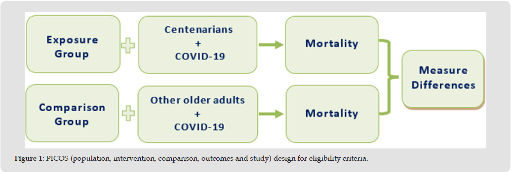 PICOS (population, intervention, comparison, outcomes, and study) design for eligibility criteria [16] was adopted in this study (Figure 1). The population of interest were individuals aged 100 years and older. The intervention was testing positive for COVID-19. The comparison group were individuals aged 60-99 years. The outcome of interest was mortality rates in both populations from COVID-19. The studies included will comprise only peer-reviewed, longitudinal observational cohort and case-control studies published from December 2019 until December 2024 in English.