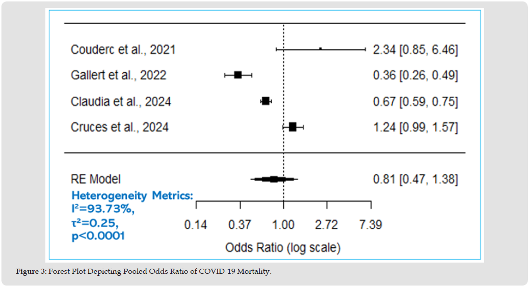 We further analysed the data to get the combined odds ratio (OR) of all studies, to determine whether a significant relation exists. The pooled odds ratio in Table 4, suggests a possible protective effect of COVID-19 in centenarians by 19 % (OR = 0.81, 95% CI: 0.47 to 1.38, p = 0.43). However, this result is not statistically significant because the confidence interval includes 1 and the p-value is 0.43. In Figure 3, Forest Plot Depicting Pooled Odds Ratio of COVID-19 Mortality, the OR of individual studies is indicated by data markers; shaded boxes reflect the statistical weight of each study; 95% CIs are indicated by the error bars; and the overall OR with 95% CI for all studies is depicted as a diamond. An OR less than 1 suggests a protective effect (i.e., the exposure reduces the odds of the outcome). In this case, the pooled OR is 0.81, which suggests a reduction of the odds of mortality by approximately 19%. However, since the CI includes 1 and p-value is >0.05, this confirms that the association is not statistically significant.