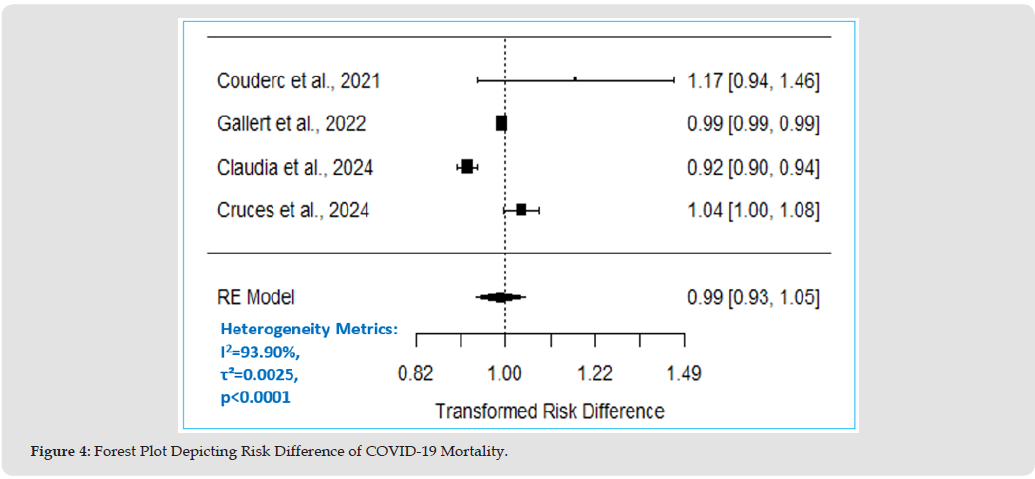 Risk difference is the probability of an outcome between two groups. It is calculated as the difference between the proportion of events in the case group and the proportion in the control group. The estimated pooled RD in Table 5. suggests 1% lower risk, or protective effect, of the outcome in the case group compared to the control group (RD = 0.99, 95% CI: 0.93 to 1.05, p = 0.69). This implies almost no difference in risk between groups. The true RD could range from 7% lower risk (0.93) to 5% higher risk (1.05); however, this effect is not statistically significant (p-value=0.69). In Figure 4, Forest Plot Depicting Pooled Risk Difference of COVID-19 Mortality, the RD of individual studies is indicated by data markers; shaded boxes reflect the statistical weight of each study; 95% CIs are indicated by the error bars; and the overall RD with 95% CI for all studies is depicted as a diamond. A RD less than 1 suggests a protective effect (i.e., the exposure reduces the risk of the outcome). In this case, the pooled RD is 0.99, which suggests a reduction of the risk of mortality by approximately 1% in the centenarian group. However, since the CI includes 1 and p-value is >0.05,, this confirms that the association is not statistically significant.