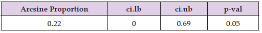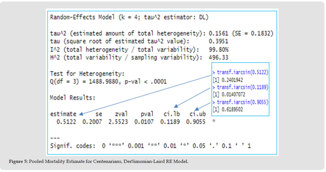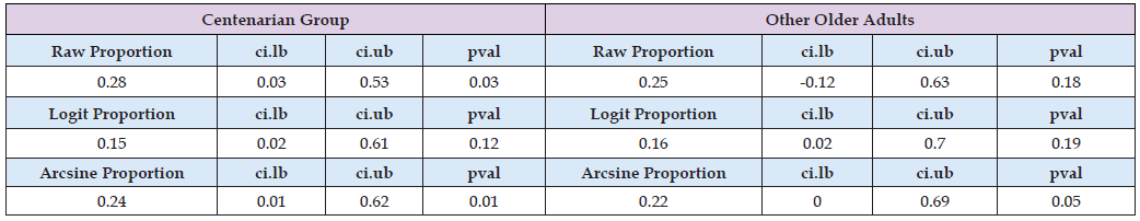 The raw and arcsine proportion analyses, but not logit proportion, showed that the mortality rate in centenarians diagnosed with COVID-19 is significant (Table 3).