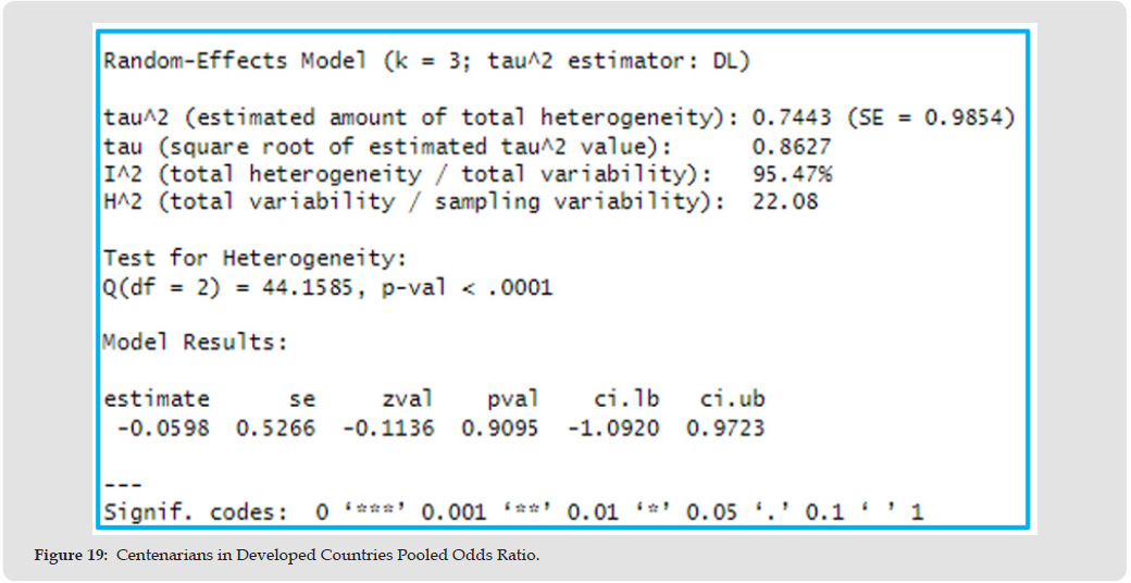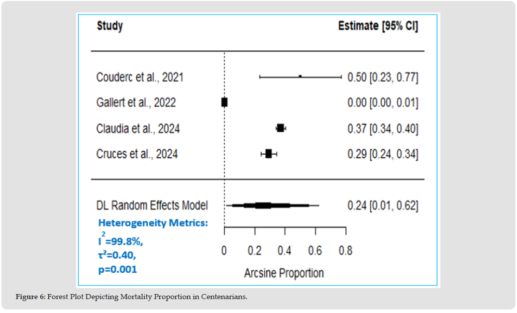 The pooled mortality proportion in the centenarian group, according to DerSimonian-Laird random effects model, Figure 5, is 0.24, (95% CI: 0.01 to 0.62). Across all studies, an estimated 24% of centenarians diagnosed with COVID-19 experienced mortality, the true proportion falls between 1% and 62% - a wide but statistically significant range, p=0.01, Table 6. Heterogeneity Metrics: (I² = 99.80%, τ² = 0.16, p < 0.0001). I2 index measures the percentage of variability in exposure effect estimates. In other words, 99.80% of the effect estimate, mortality, is due to study differences rather than chance. τ² measures between-study variance; higher values mean more variability while Cochran’s Q test confirms significant heterogeneity P <0.05, (Figure 6).