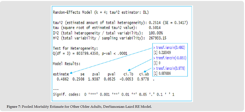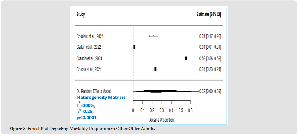 The pooled mortality proportion in the other older adults group is 0.22, (95% CI: 0 to 0.69) (Table 7). Across all studies, an estimated 22% of other older adults diagnosed with COVID-19 experienced mortality, a little less than that for centenarians (24%). Other older adults’ mortality proportion likely falls between 0% and 69% - a wide but not a statistically significant range (p>0.05). Heterogeneity Metrics: (I² = 100.00%, τ² = 0.25, p < 0.0001). The percentage of variability in exposure effect estimates is 100%. In other words, 100% of the pooled mortality estimate, is due to between study heterogeneity and not chance. τ² shows moderate variance while Cochran’s Q test confirms significant heterogeneity (p < 0.05), (Figures 7 & 8). We used arcsine proportions when running all our pooled estimate analyses because arcsine stabilises variance for extreme proportions (near 0% or 100%), handles sparse data better than raw proportions and reduces bias when event rates vary widely across studies. Contrast with OR/RD: may have been insignificant due to rare events or imbalanced group sizes, while arcsine accounts for these issues.