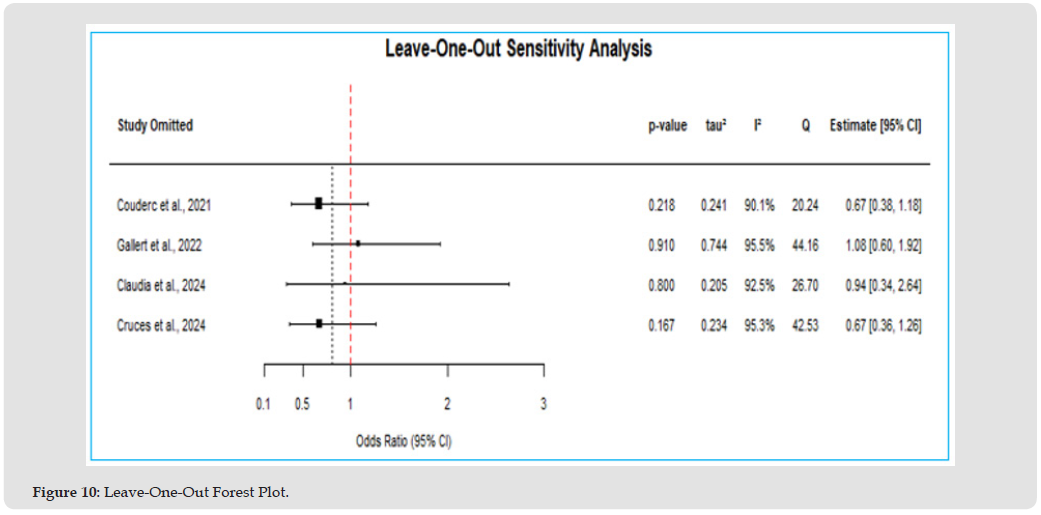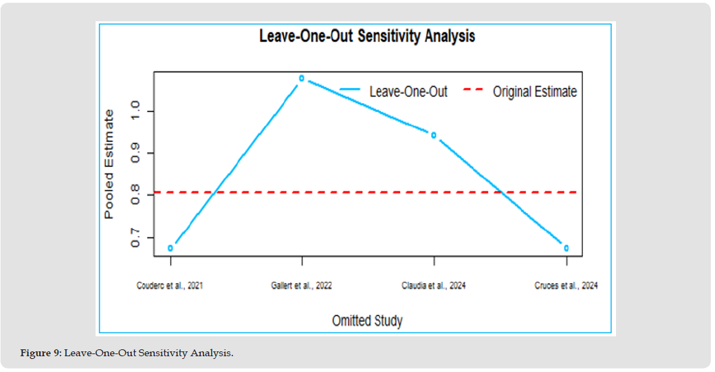 The leave-one-out sensitivity analysis plot illustrates how the pooled effect estimates from our meta-analysis shifts when each study is excluded one at a time. In Figure 9, the blue line represents the recalculated pooled estimate for each scenario, with each point corresponding to the omission of a specific study indicated on the x-axis. This visualizes the impact of each individual study on the overall meta-analytic result. The red dashed line displays the original pooled estimate, or the log odds ratio, calculated for all studies included. The x-axis lists the omitted studies, while the y-axis shows the pooled effect size, log odds ratio, for each leave-one-out analysis. The leave-one-out analysis, Figure 9, shows that although the pooled estimates (blue line) fluctuate slightly with the omission of each study, they consistently remain close to the original pooled estimate (red dashed line). Omitting any individual study does not result in a substantial change to the overall effect size, and even the largest deviations are minor. This suggests that no single study exerts a disproportionate influence on the meta-analysis results. Consequently, our findings are robust and stable, reinforcing the reliability and credibility of the overall conclusions.