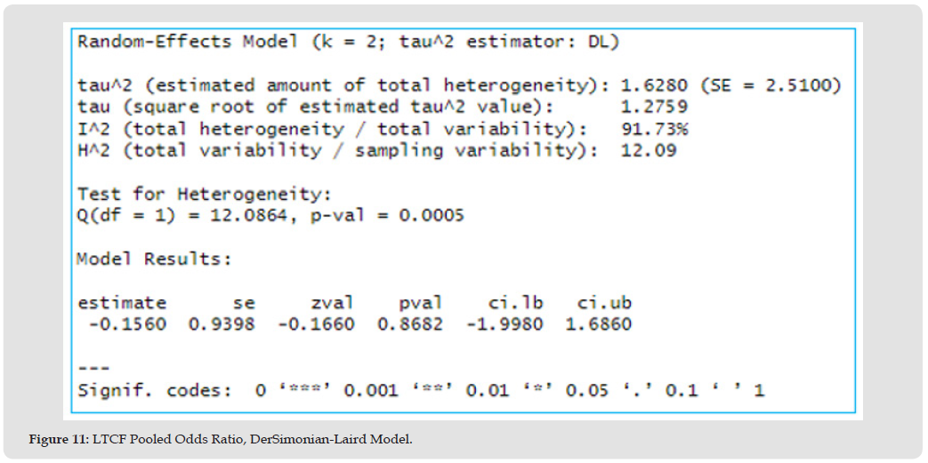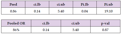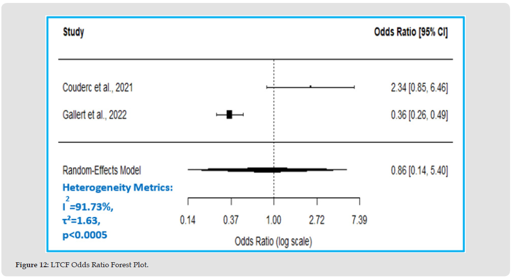 The estimated average OR suggests 14% lower odds (OR=0.86, 95% CI: 0.14 to 5.40, p=0.87) of the mortality outcome in the centenarian group compared to other older adults. The true OR ranges from 86% lower odds to more than 5-fold higher odds, however, this effect is insignificant, p>0.05, Figure 11, Table 8. Figure 12 Forest plot shows the estimated OR with 14% lower mortality odds (since OR < 1) in the LTCF centenarian group compared to the control group, however, this effect is insignificant, as the CI crosses one.