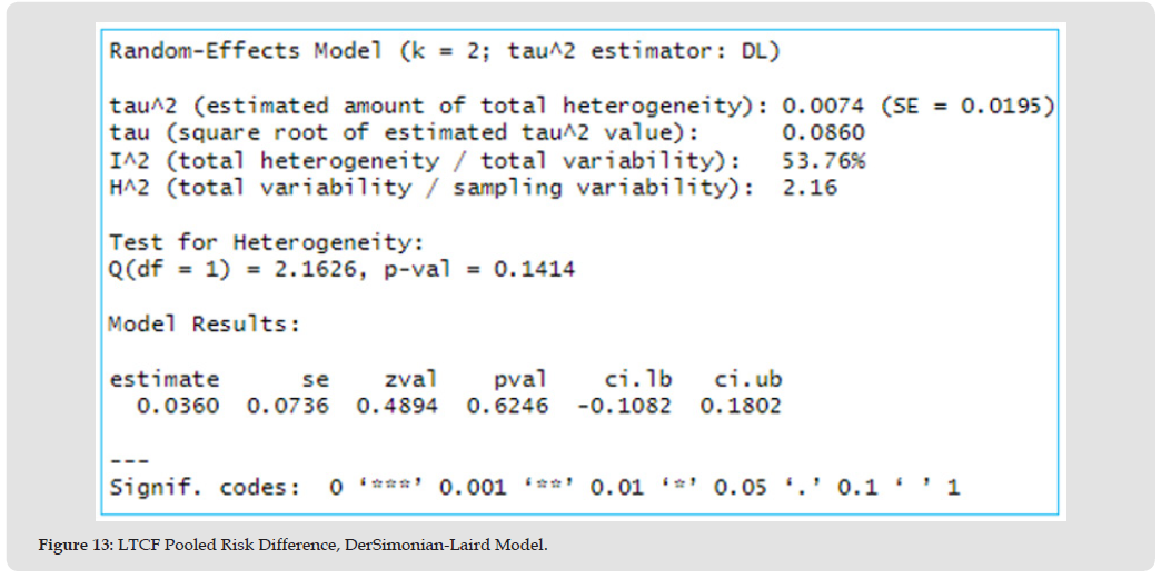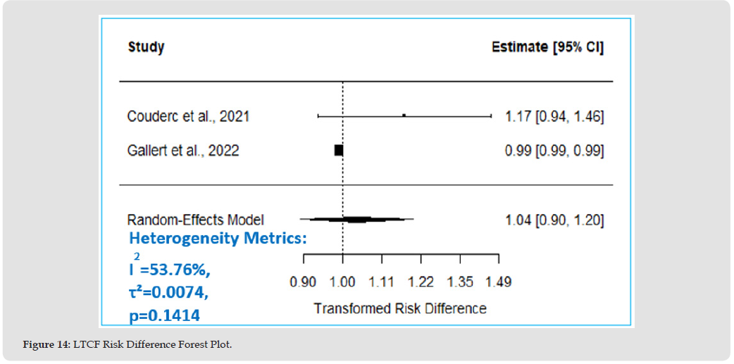 The estimated average effect suggests 4% higher risk of mortality (RD=1.04, 95% CI: 0.90 to 1.20, p=0.62) in the LTCF centenarian group compared to other older adults. The true RD could range from 10% lower risk to 20% higher risk; however, this effect is insignificant, p>0.05, Figure 13, Table 9.Figure 14 Forest plot shows the estimated average RD of 4% higher mortality risk (since RD > 1) in the LTCF centenarian group compared to the control group, however, this effect is insignificant as the CI crosses one.