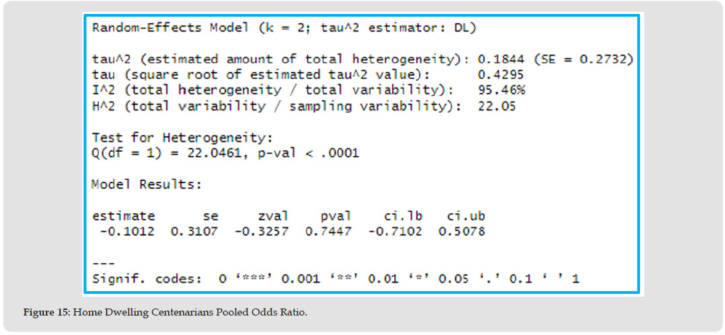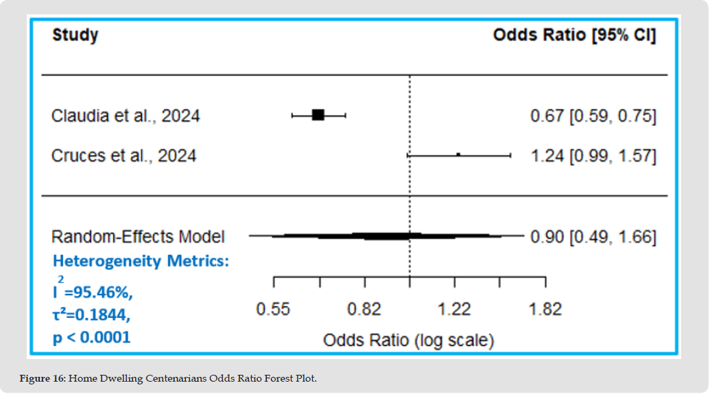 The estimated pooled OR suggests 10% lower mortality odds in home dwelling centenarians compared to other older adults (OR= 0.9, 95% CI= 0.49 to 1.66, p=0.75). The true OR could range from 51% lower odds to 66% higher odds, however, this effect is insignificant, p-value >0.05, Figure 15, Table 10. Figure 16 Forest plot shows the estimated OR suggesting 10% lower mortality odds in the home dwelling centenarian group compared to other older adults, however, this effect is insignificant, as the CI crosses one.