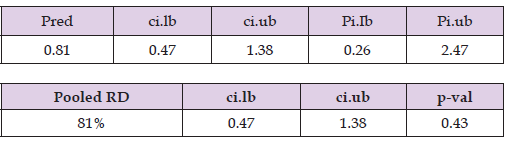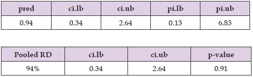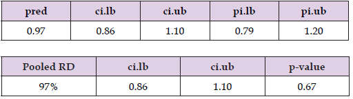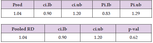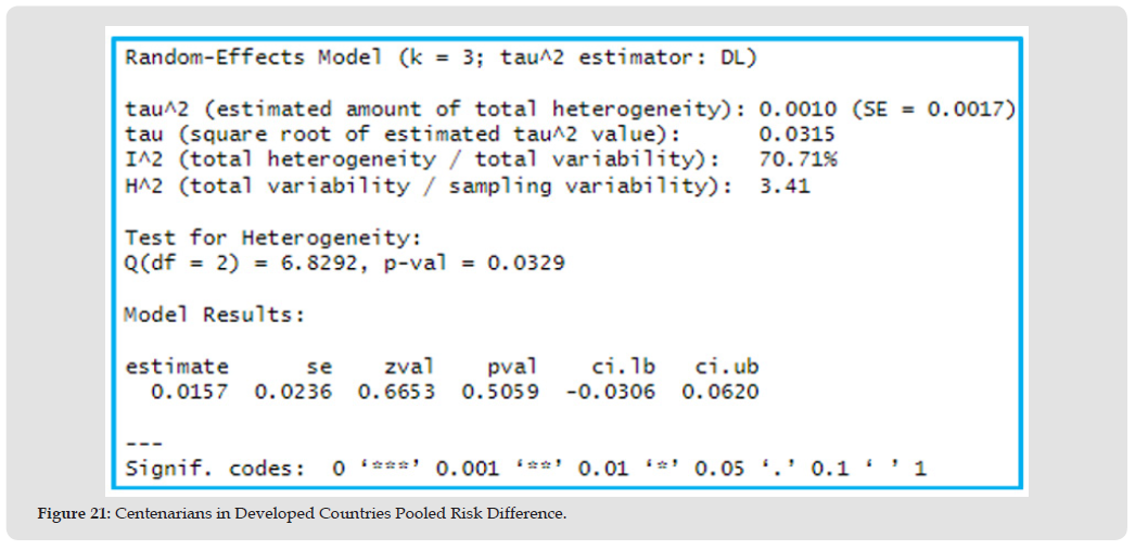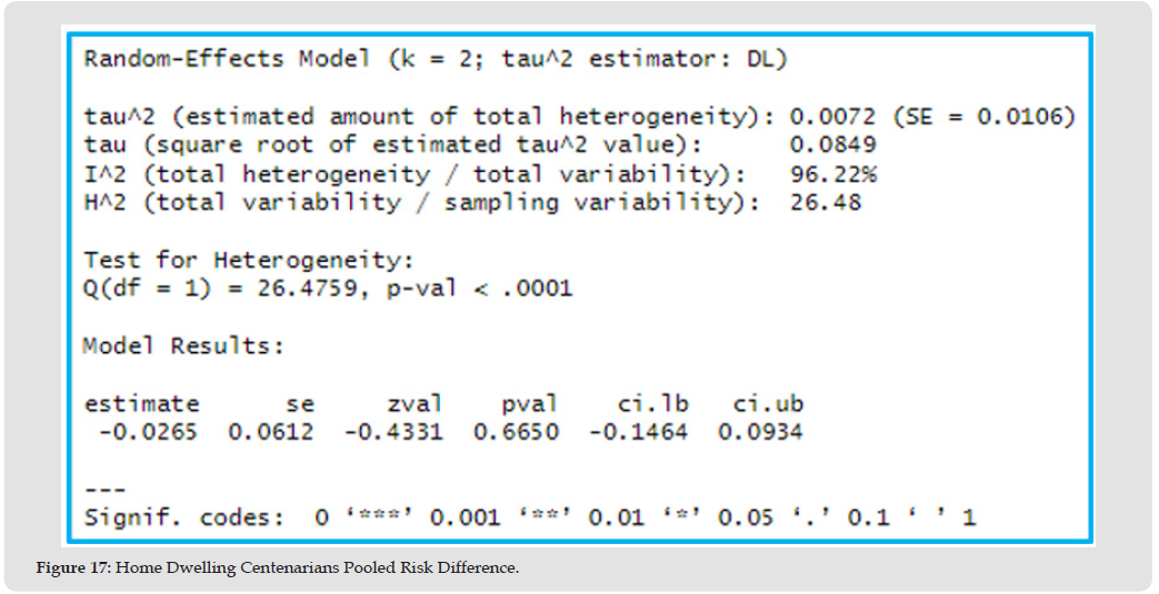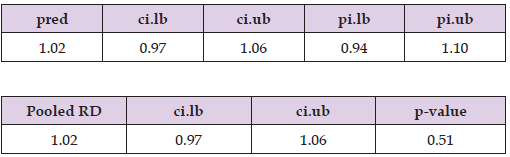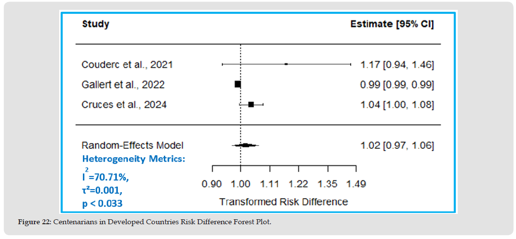 The estimated RD suggests 2% higher mortality risk (RD= 1.02, 95% CI: 0.97 to 1.06, p=0.51) in the centenarian group compared to other older adults. The true RD could plausibly range from 3% lower risk to 6% higher risk; however, this effect is insignificant, p-value >0.05, Figure 21, Table 13.Figure 22 Forest plot shows the pooled RD suggesting 2% higher mortality risk in the centenarian group compared to other older adults, however, this effect is insignificant as the CI crosses one.