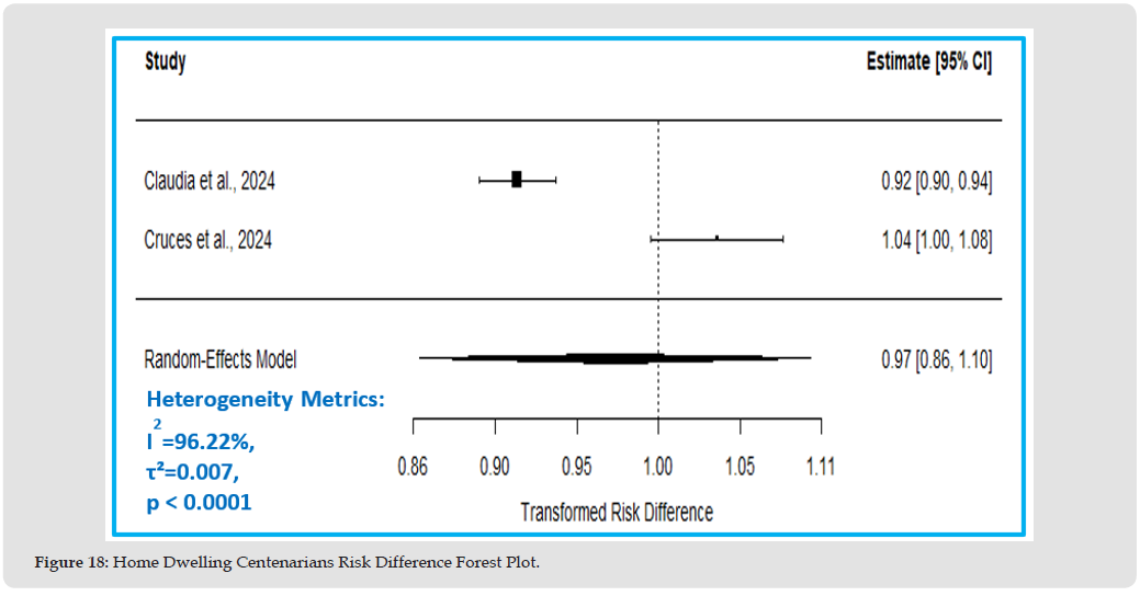 The estimated risk difference shows 3% lower mortality risk in home dwelling centenarians compared to other older adults (RD=0.97, 95% CI: 0.86 to 1.10, p=0.67). The true RD could range from 14% lower risk to 10% higher risk; however, this effect is insignificant, p-value >0.05, Figure 17, Table 11. Figure 18 Forest plot shows the estimated RD suggesting 3% lower mortality risk in the home dwelling centenarian group compared to other older adults, however, this effect is insignificant as the CI crosses one.