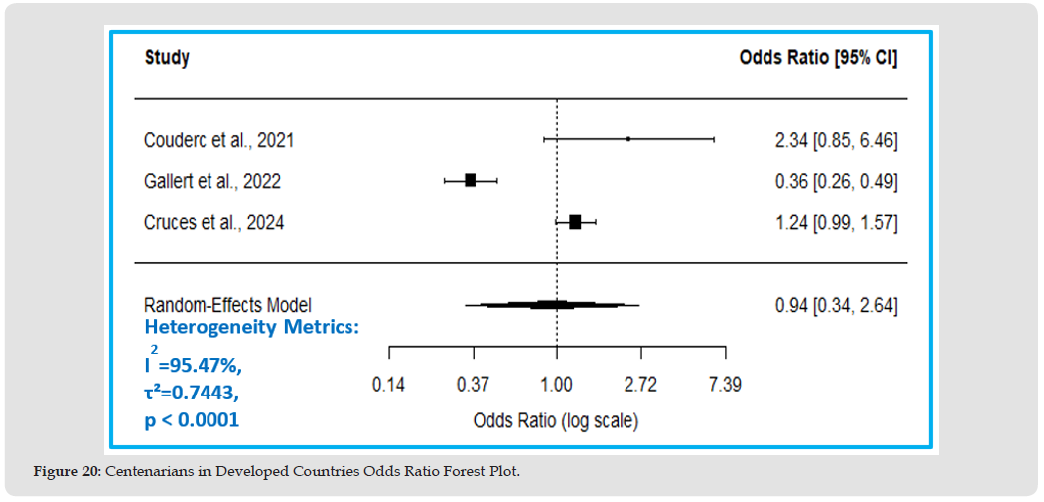 The estimated OR suggests 6% lower mortality odds in centenarians compared to other older adults (OR=0.94, 95% CI:0.34 to 2.64, p=0.91). The true OR could range from 66% lower odds to more than 2-fold higher odds, however, this effect is insignificant, p-value >0.05, Figure 19, Table 12. Figure 20 Forest plot shows the estimated OR with 6% lower mortality odds in the centenarian group compared to other older adults, however, this effect is insignificant, as the CI crosses one.