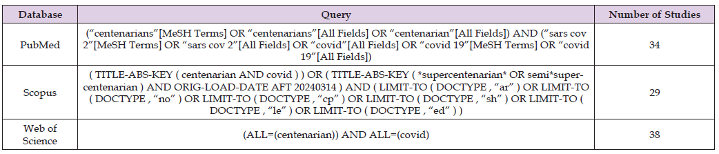 PubMed, Scopus, and Web of Science electronic search databases were consulted by 2 researchers on January 7, 2025, to search for studies published between December 2019 and December 2024 to identify any cohort and case-control studies that investigated the relationship between COVID-19 diagnosis and mortality in centenarians versus other older adults. The main keywords used were “centenarians” and “covid” in addition to their variations (Table 1). In the search strategy, keywords were systematically combined using the Boolean operators “AND” and “OR” to refine and expand the retrieval of relevant literature. The references of the studies included in the full-text evaluation phase were reviewed independently by the 2 researchers to identify potentially relevant studies that were not considered in earlier search phases. The studies were screened against the eligibility criteria in 2 phases: title and abstract screening followed by fulltext screening. In cases of disagreement between the 2 reviewers at any stage, a consensus process was undertaken. If a resolution was not reached, a third reviewer was consulted for resolution. If data are missing or unclear, attempts will be made to contact the study authors for clarification. If contact cannot be established, the study will be excluded from our analysis, and this will be addressed in the discussion section. Science reviews, systematic reviews, and meta-analyses found in the automated search were excluded from our study.