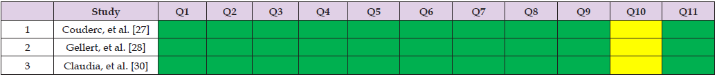 The quality of studies was assessed using the Joanna Briggs Institute Critical Appraisal Checklist (26) for case-control, and cohortstudies, respectively. Quality assessment of the studies included are displayed in Tables 14 & 15. All studies showed good quality.