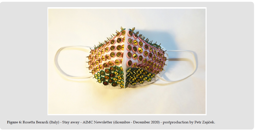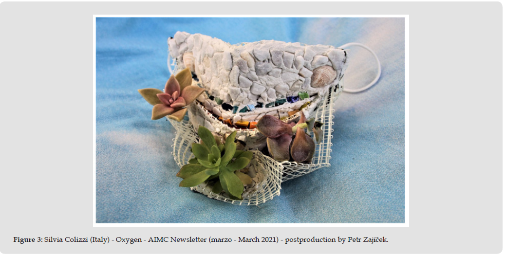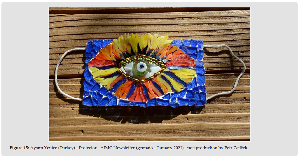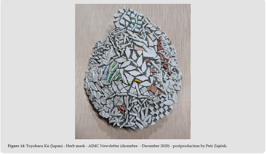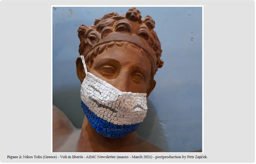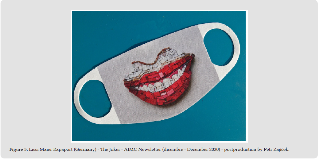 The AIMC organised the project entitled Mascherine volanti (Flying Masks). This study brings examples of work by art of mosaic creators that speak for themselves. The author of this study would like to remark the following as regards the Mascherine volanti project: it is a systematic or even system reaction of a prestigious association of visual artists suggesting that the AIMC may have been aware of the privileged position of the art of mosaic with regard to artistic expression of the COVID-19 pandemic. At the same time, mosaic creators decided to focus on the topic of the face mask; they focused on the topic of communication, the issue of words and silence, as if the meaning of the COVID-19 pandemic was concealed in this specific aspect. As artist is aware that while things unfold in a certain way on the outside, their overall meaning, some decisive second plan is present in the background. The background of the COVID-19 pandemic seems to have involved the issue of dynamics of words and silence, the impossibility of silence in the current world and therefore the subsequent impossibility of words. It is also important that the AIMC did not leave the real world behind in its activities, did not depart into the cyberspace; it continued in its original creation in-situ, even magnifying this work without resorting to recycling and re-adapting past works.